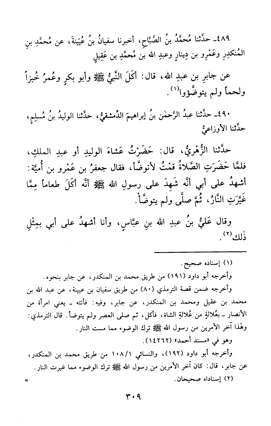 489- حَدَّثَنَا مُحَمَّدُ بْنُ الصَّبَّاحِ ، أَخْبَرَنَا سُفْيَانُ بْنُ عُيَيْنَةَ ، عَنْ مُحَمَّدِ بْنِ الْمُنْكَدِرِ , وَعَمْرِو بْنِ دِينَارٍ , وَعَبْدِ اللهِ بْنِ مُحَمَّدِ بْنِ عَقِيلٍ ، عَنْ جَابِرِ بْنِ عَبْدِ اللهِ ، قَالَ : أَكَلَ النَّبِيُّ صَلَّى الله عَليْهِ وسَلَّمَ , وَأَبُو بَكْرٍ , وَعُمَرُ , خُبْزًا وَلَحْمًا ، وَلَمْ يَتَوَضَّؤُوا.