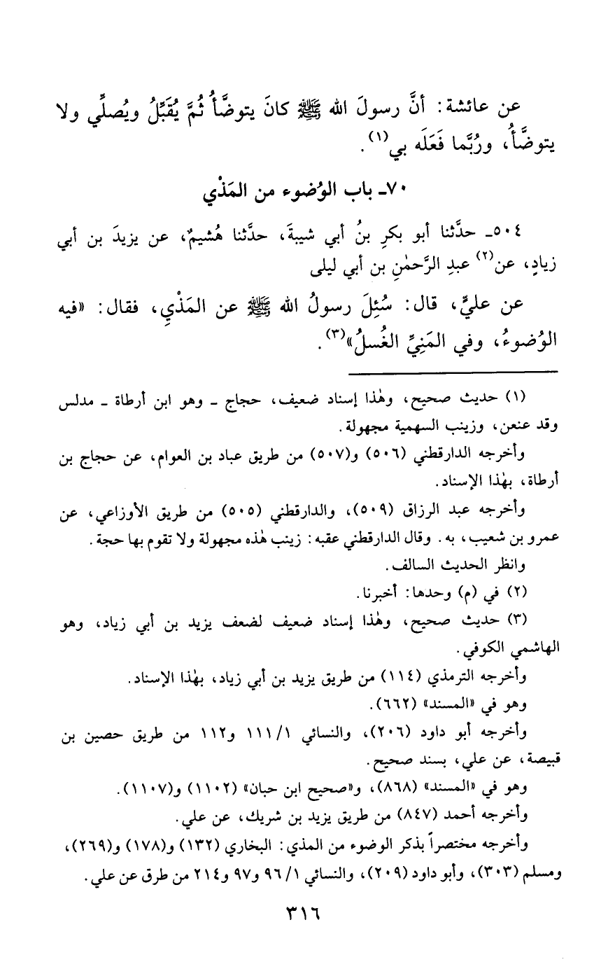 504- حَدَّثَنَا أَبُو بَكْرِ بْنُ أَبِي شَيْبَةَ ، حَدَّثَنَا هُشَيْمٌ ، عَنْ يَزِيدَ بْنِ أَبِي زِيَادٍ ، عَنْ عَبْدِ الرَّحْمَنِ بْنِ أَبِي لَيْلَى ، عَنْ عَلِيٍّ , قَالَ : سُئِلَ رَسُولُ اللهِ صَلَّى الله عَليْهِ وسَلَّمَ عَنِ الْمَذْيِ , فَقَالَ : فِيهِ الْوُضُوءُ ، وَفِي الْمَنِيِّ الْغُسْلُ.