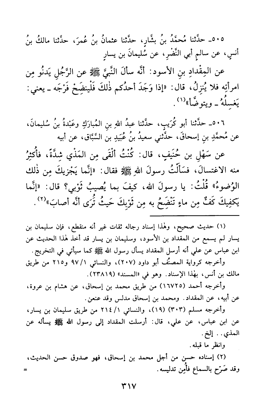 505- حَدَّثَنَا مُحَمَّدُ بْنُ بَشَّارٍ ، حَدَّثَنَا عُثْمَانُ بْنُ عُمَرَ ، حَدَّثَنَا مَالِكُ بْنُ أَنَسٍ ، عَنْ سَالِمٍ أَبِي النَّضْرِ ، عَنْ سُلَيْمَانَ بْنِ يَسَارٍ ، عَنِ الْمِقْدَادِ بْنِ الأَسْوَدِ ، أَنَّهُ سَأَلَ النَّبِيَّ صَلَّى الله عَليْهِ وسَلَّمَ عَنِ الرَّجْلِ يَدْنُو مِنَ امْرَأَتِهِ ، فَلاَ يُنْزِلُ , قَالَ : إِذَا وَجَدَ أَحَدُكُمْ ذَلِكَ ، فَلْيَنْضَحْ فَرْجَهُ ، يَعْنِي يَغْسِلْهُ ، وَيَتَوَضَّأْ.