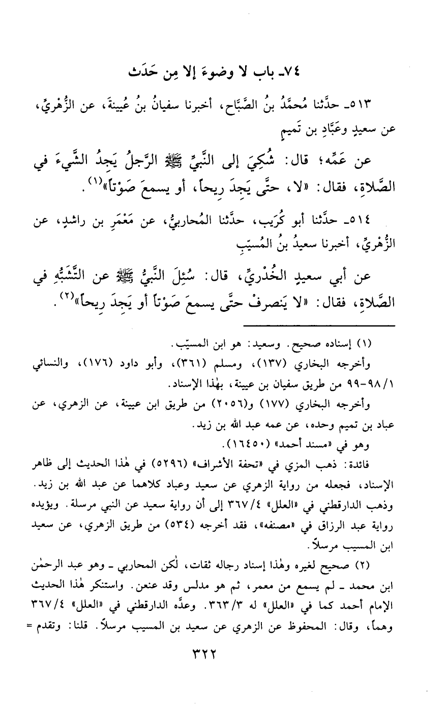 513- حَدَّثَنَا مُحَمَّدُ بْنُ الصَّبَّاحِ ، أَخْبَرَنَا سُفْيَانُ بْنُ عُيَيْنَةَ ، عَنِ الزُّهْرِيِّ ، عَنْ سَعِيدٍ , وَعَبَّادِ بْنِ تَمِيمٍ ، عَنْ عَمِّهِ , قَالَ : شُكِيَ إِلَى النَّبِيِّ صَلَّى الله عَليْهِ وسَلَّمَ الرَّجُلُ يَجِدُ الشَّيْءَ فِي الصَّلاَةِ ، فَقَالَ : لاَ ، حَتَّى يَجِدَ رِيحًا ، أَوْ يَسْمَعَ صَوْتًا.