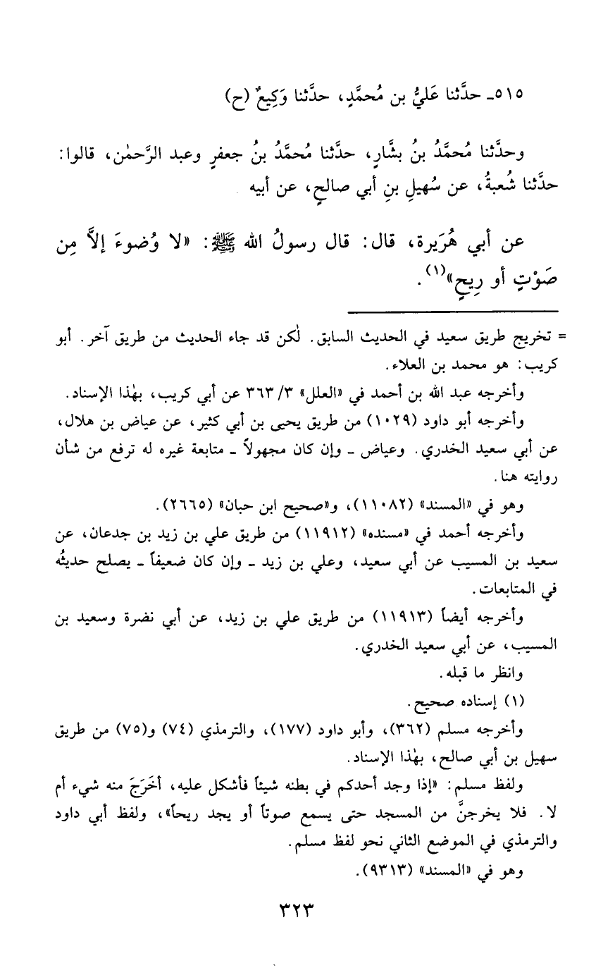 515- حَدَّثَنَا عَلِيُّ بْنُ مُحَمَّدٍ ، حَدَّثَنَا وَكِيعٌ (ح) وَحَدَّثَنَا مُحَمَّدُ بْنُ بَشَّارٍ ، حَدَّثَنَا مُحَمَّدُ بْنُ جَعْفَرٍ , وَعَبْدُ الرَّحْمَنِ , قَالُوا : حَدَّثَنَا شُعْبَةُ ، عَنْ سُهَيْلِ بْنِ أَبِي صَالِحٍ ، عَنْ أَبِيهِ ، عَنْ أَبِي هُرَيْرَةَ , قَالَ : قَالَ رَسُولُ اللهِ صَلَّى الله عَليْهِ وسَلَّمَ : لاَ وُضُوءَ إِلاَّ مِنْ صَوْتٍ أَوْ رِيحٍ.