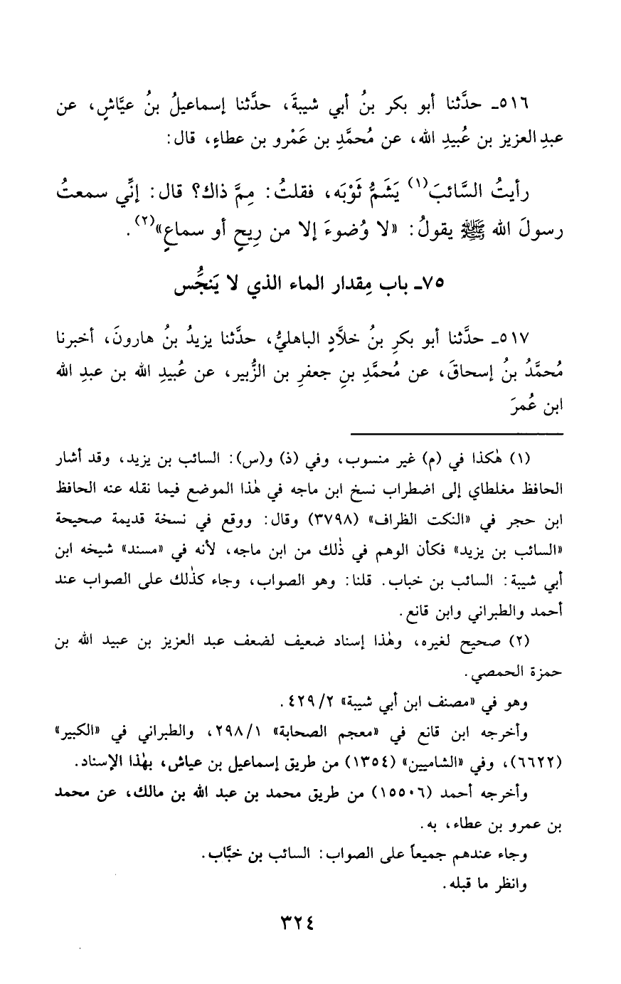 516- حَدَّثَنَا أَبُو بَكْرِ بْنُ أَبِي شَيْبَةَ ، حَدَّثَنَا إِسْمَاعِيلُ بْنُ عَيَّاشٍ ، عَنْ عَبْدِ الْعَزِيزِ بْنِ عُبَيْدِ اللهِ ، عَنْ مُحَمَّدِ بْنِ عَمْرِو بْنِ عَطَاءٍ ، قَالَ : رَأَيْتُ السَّائِبَ (1) يَشُمُّ ثَوْبَهُ ، فَقُلْتُ : مِمَّ ذَاكَ ؟ قَالَ : إِنِّي سَمِعْتُ رَسُولَ اللهِ صَلَّى الله عَليْهِ وسَلَّمَ يَقُولُ : لاَ وُضُوءَ إِلاَّ مِنْ رِيحٍ أَوْ سَمَاعٍ.
