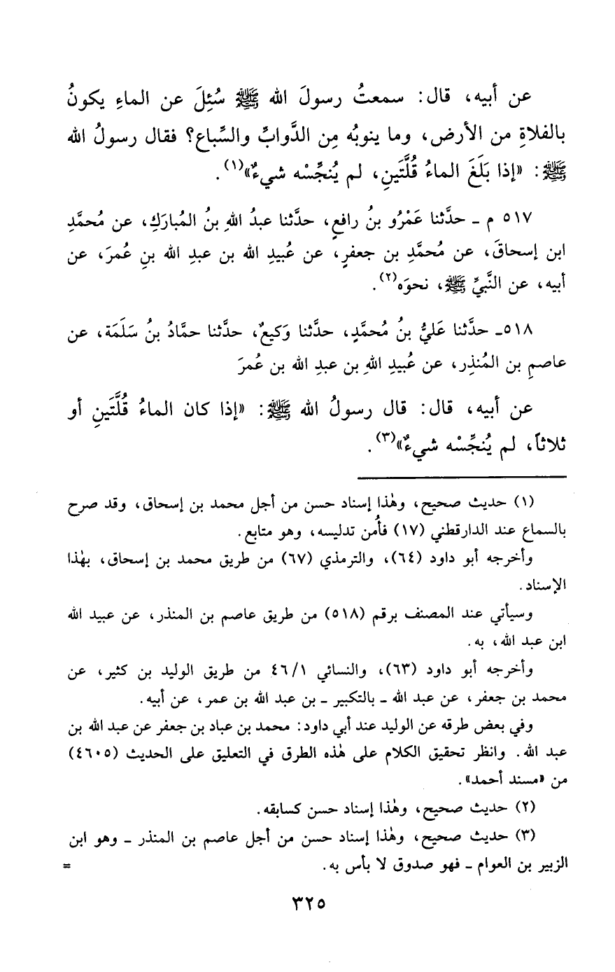 518- حَدَّثَنَا عَلِيُّ بْنُ مُحَمَّدٍ ، حَدَّثَنَا وَكِيعٌ ، حَدَّثَنَا حَمَّادُ بْنُ سَلَمَةَ ، عَنْ عَاصِمِ بْنِ الْمُنْذِرِ ، عَنْ عُبَيْدِ اللهِ بْنِ عَبْدِ اللهِ بْنِ عُمَرَ ، عَنْ أَبِيهِ , قَالَ : قَالَ رَسُولُ اللهِ صَلَّى الله عَليْهِ وسَلَّمَ : إِذَا كَانَ الْمَاءُ قُلَّتَيْنِ ، أَوْ ثَلاَثًا ، لَمْ يُنَجِّسْهُ شَيْءٌ.