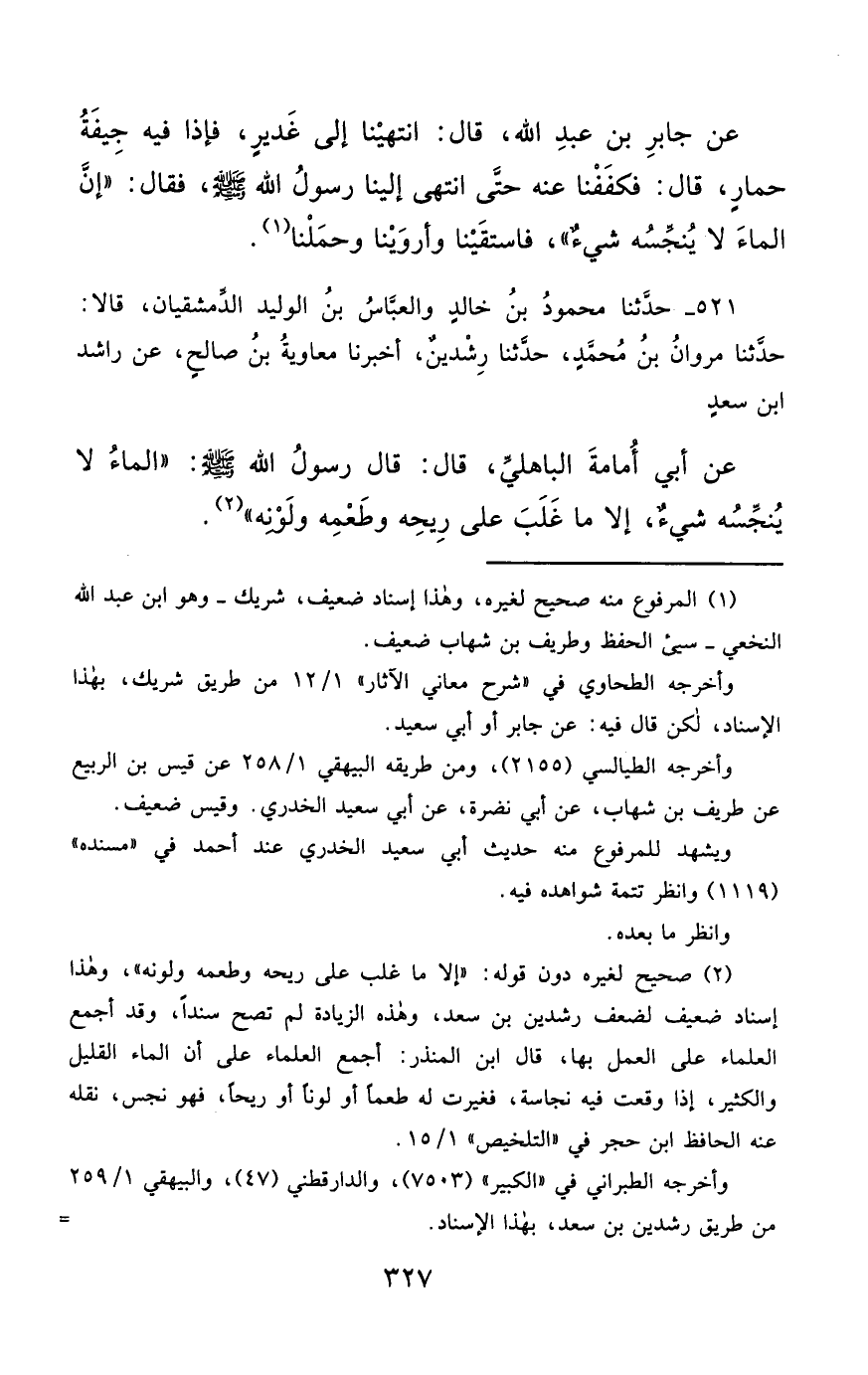 521- حَدَّثَنَا مَحْمُودُ بْنُ خَالِدٍ , وَالْعَبَّاسُ بْنُ الْوَلِيدِ الدِّمَشْقِيَّانِ , قَالاَ : حَدَّثَنَا مَرْوَانُ بْنُ مُحَمَّدٍ ، حَدَّثَنَا رِشْدِينٌ ، أَخْبَرَنَا مُعَاوِيَةُ بْنُ صَالِحٍ ، عَنْ رَاشِدِ بْنِ سَعْدٍ ، عَنْ أَبِي أُمَامَةَ الْبَاهِلِيِّ , قَالَ : قَالَ رَسُولُ اللهِ صَلَّى الله عَليْهِ وسَلَّمَ : الْمَاءُ لاَ يُنَجِّسُهُ شَيْءٌ , إِلاَّ مَا غَلَبَ عَلَى رِيحِهِ وَطَعْمِهِ وَلَوْنِهِ.