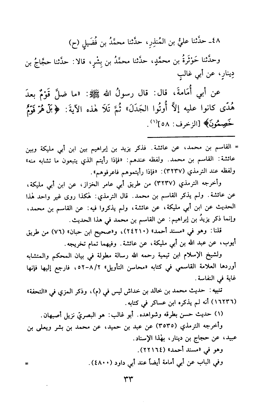 48- حَدَّثَنَا عَلِيُّ بْنُ الْمُنْذِرِ ، حَدَّثَنَا مُحَمَّدُ بْنُ فُضَيْلٍ (ح) وَحَدَّثَنَا حَوْثَرَةُ بْنُ مُحَمَّدٍ ، حَدَّثَنَا مُحَمَّدُ بْنُ بِشْرٍ ، قَالاَ : حَدَّثَنَا حَجَّاجُ بْنُ دِينَارٍ ، عَنْ أَبِي غَالِبٍ ، عَنْ أَبِي أُمَامَةَ ، قَالَ : قَالَ رَسُولُ اللهِ صَلَّى الله عَليْهِ وسَلَّمَ : مَا ضَلَّ قَوْمٌ بَعْدَ هُدًى كَانُوا عَلَيْهِ , إِلاَّ أُوتُوا الْجَدَلَ , ثُمَّ تَلاَ هَذِهِ الآيَةَ : {بَلْ هُمْ قَوْمٌ خَصِمُونَ}.