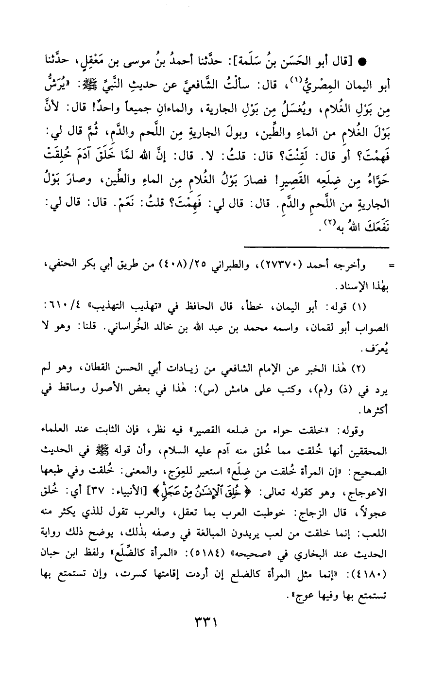 قَالَ أَبُو الْحَسَنِ بْنُ سَلَمَةَ (1): حَدَّثَنَا أَحْمَدُ بْنُ مُوسَى بْنِ مَعْقِلٍ ، حَدَّثَنَا أَبُو الْيَمَانِ الْمِصْرِيُّ ، قَالَ : سَأَلْتُ الشَّافِعِيَّ عَنْ حَدِيثِ النَّبِيِّ صَلَّى الله عَليْهِ وسَلَّمَ يُرَشُّ مِنْ بَوْلِ الْغُلاَمِ ، وَيُغْسَلُ مِنْ بَوْلِ الْجَارِيَةِ ، وَالْمَاءَانِ جَمِيعًا وَاحِدٌ , قَالَ : لأَنَّ بَوْلَ الْغُلاَمِ مِنَ الْمَاءِ وَالطِّينِ ، وَبَوْلَ الْجَارِيَةِ مِنَ اللَّحْمِ وَالدَّمِ ، ثُمَّ قَالَ لِي : فَهِمْتَ ؟ أَوْ قَالَ : لَقِنْتَ ؟ قَالَ : قُلْتُ : لاَ , قَالَ : إِنَّ اللَّهَ لَمَّا خَلَقَ آدَمَ ، خُلِقَتْ حَوَّاءُ مِنْ ضِلْعِهِ الْقَصِيرِ ، فَصَارَ بَوْلُ الْغُلاَمِ مِنَ الْمَاءِ وَالطِّينِ ، وَصَارَ بَوْلُ الْجَارِيَةِ مِنَ اللَّحْمِ وَالدَّمِ , قَالَ : قَالَ لِي : فَهِمْتَ ؟ قُلْتُ : نَعَمْ , قَالَ : قَالَ لِي : نَفَعَكَ اللَّهُ به.