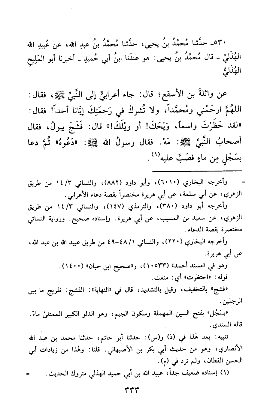 530- حَدَّثَنَا مُحَمَّدُ بْنُ يَحْيَى ، حَدَّثَنَا مُحَمَّدُ بْنُ عَبْدِ اللهِ ، عَنْ عُبَيْدِ اللهِ الْهُذَلِيِّ ، قَالَ مُحَمَّدُ بْنُ يَحْيَى : هُوَ عِنْدَنَا ابْنُ أَبِي حُمَيْدٍ ، أَخْبَرَنَا أَبُو الْمَلِيحِ الْهُذَلِيُّ ، عَنْ وَاثِلَةَ بْنِ الأَسْقَعِ ، قَالَ : جَاءَ أَعْرَابِيٌّ إِلَى النَّبِيِّ صَلَّى الله عَليْهِ وسَلَّمَ ، فَقَالَ : اللَّهُمَّ ارْحَمْنِي وَمُحَمَّدًا ، وَلاَ تُشْرِكْ فِي رَحْمَتِكَ إِيَّانَا أَحَدًا ، فَقَالَ : لَقَدْ حَظَرْتَ وَاسِعًا ، وَيْحَكَ أَوْ وَيْلَكَ , قَالَ : فَشَجَ يَبُولُ ، فَقَالَ أَصْحَابُ النَّبِيِّ صَلَّى الله عَليْهِ وسَلَّمَ : مَهْ ، فَقَالَ رَسُولُ اللهِ صَلَّى الله عَليْهِ وسَلَّمَ : دَعُوهُ ، ثُمَّ دَعَا بِسَجْلٍ مِنْ مَاءٍ ، فَصَبَّ عَلَيْهِ.