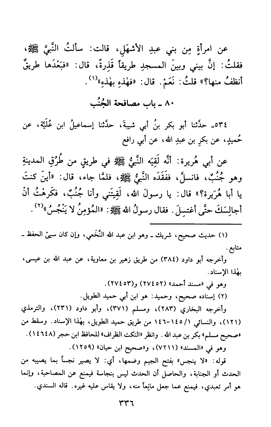 534- حَدَّثَنَا أَبُو بَكْرِ بْنُ أَبِي شَيْبَةَ ، حَدَّثَنَا إِسْمَاعِيلُ ابْنُ عُلَيَّةَ ، عَنْ حُمَيْدٍ ، عَنْ بَكْرِ بْنِ عَبْدِ اللهِ ، عَنْ أَبِي رَافِعٍ ، عَنْ أَبِي هُرَيْرَةَ , أَنَّهُ لَقِيَهُ النَّبِيُّ صَلَّى الله عَليْهِ وسَلَّمَ فِي طَرِيقٍ مِنْ طُرُقِ الْمَدِينَةِ ، وَهُوَ جُنُبٌ ، فَانْسَلَّ ، فَفَقَدَهُ النَّبِيُّ صَلَّى الله عَليْهِ وسَلَّمَ ، فَلَمَّا جَاءَ قَالَ : أَيْنَ كُنْتَ يَا أَبَا هُرَيْرَةَ ؟ قَالَ : يَا رَسُولَ اللهِ ، لَقِيتَنِي وَأَنَا جُنُبٌ ، فَكَرِهْتُ أَنْ أُجَالِسَكَ حَتَّى أَغْتَسِلَ ، فَقَالَ رَسُولُ اللهِ صَلَّى الله عَليْهِ وسَلَّمَ : الْمُؤْمِنُ لاَ يَنْجُسُ.