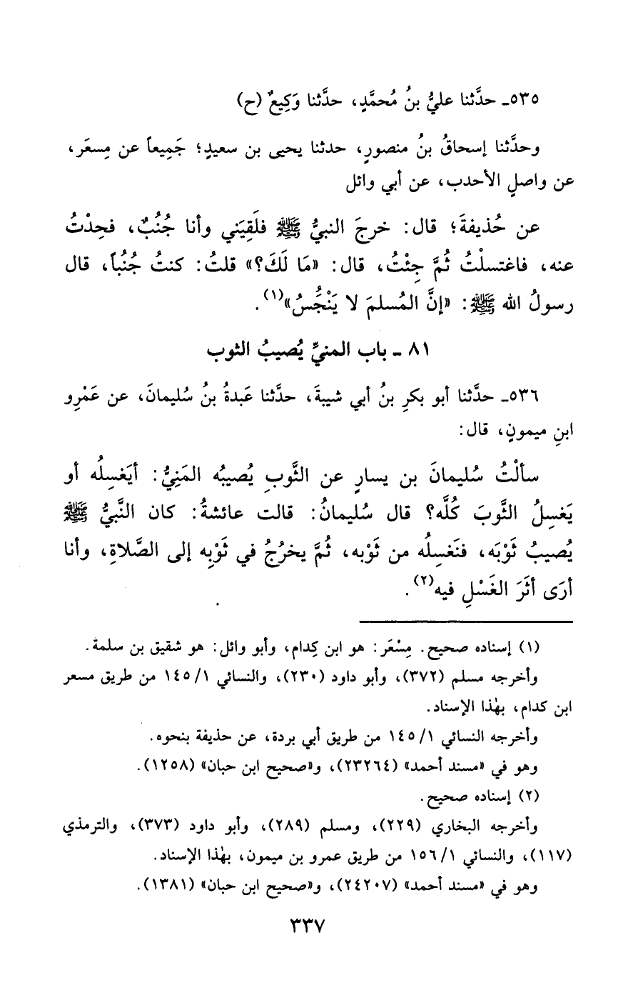 535- حَدَّثَنَا عَلِيُّ بْنُ مُحَمَّدٍ ، حَدَّثَنَا وَكِيعٌ (ح) وَحَدَّثَنَا إِسْحَاقُ بْنُ مَنْصُورٍ ، حَدَّثَنَا يَحْيَى بْنُ سَعِيدٍ ؛ جَمِيعًا عَنْ مِسْعَرٍ ، عَنْ وَاصِلٍ الأَحْدَبِ ، عَنْ أَبِي وَائِلٍ ، عَنْ حُذَيْفَةَ , قَالَ : خَرَجَ النَّبِيُّ صَلَّى الله عَليْهِ وسَلَّمَ , فَلَقِيَنِي وَأَنَا جُنُبٌ ، فَحِدْتُ عَنْهُ ، فَاغْتَسَلْتُ ، ثُمَّ جِئْتُ ، قَالَ : مَا لَكَ ؟ قُلْتُ : كُنْتُ جُنُبًا ، قَالَ رَسُولُ اللهِ صَلَّى الله عَليْهِ وسَلَّمَ : إِنَّ الْمُسْلِمَ لاَ يَنْجُسُ.