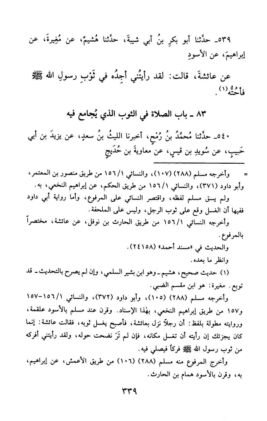 539- حَدَّثَنَا أَبُو بَكْرِ بْنُ أَبِي شَيْبَةَ ، حَدَّثَنَا هُشَيْمٌ ، عَنْ مُغِيرَةَ ، عَنْ إِبْرَاهِيمَ ، عَنِ الأَسْوَدِ ، عَنْ عَائِشَةَ , قَالَتْ : لَقَدْ رَأَيْتُنِي أَجِدُهُ فِي ثَوْبِ رَسُولِ اللهِ صَلَّى الله عَليْهِ وسَلَّمَ , فَأَحُتُّهُ.