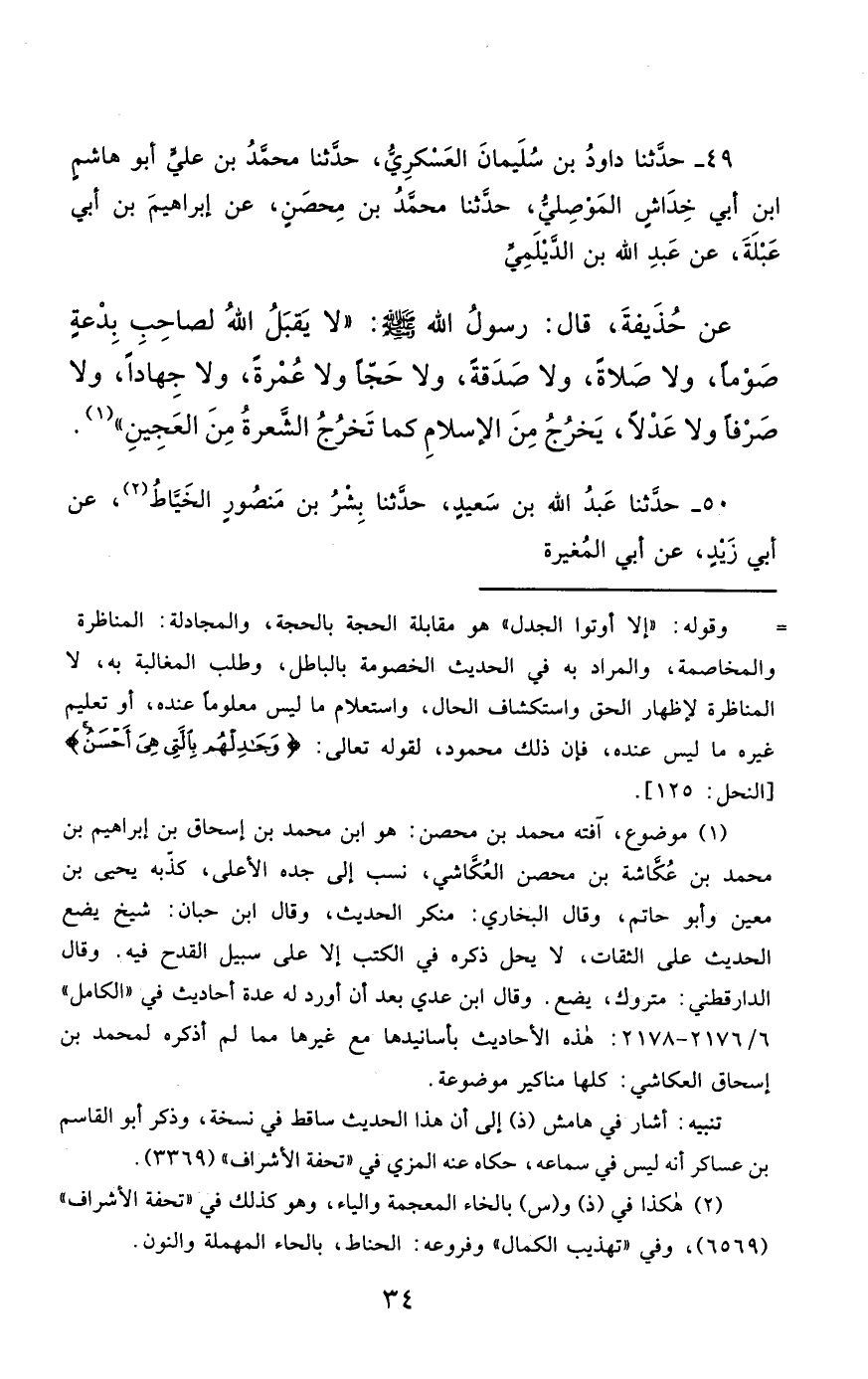 49- حَدَّثَنَا دَاوُدُ بْنُ سُلَيْمَانَ الْعَسْكَرِيُّ ، حَدَّثَنَا مُحَمَّدُ بْنُ عَلِيٍّ أَبُو هَاشِمٍ بْنِ أَبِي خِدَاشٍ الْمَوْصِلِيُّ ، حَدَّثَنَا مُحَمَّدُ بْنُ مِحْصَنٍ ، عَنْ إِبْرَاهِيمَ بْنِ أَبِي عَبْلَةَ ، عَنْ عَبْدِ اللهِ بْنِ الدَّيْلَمِيِّ ، عَنْ حُذَيْفَةَ ، قَالَ : قَالَ رَسُولُ اللهِ صَلَّى الله عَليْهِ وسَلَّمَ : لاَ يَقْبَلُ اللَّهُ لِصَاحِبِ بِدْعَةٍ صَوْمًا ، وَلاَ صَلاَةً ، وَلاَ صَدَقَةً ، وَلاَ حَجًّا ، وَلاَ عُمْرَةً ، وَلاَ جِهَادًا ، وَلاَ صَرْفًا ، وَلاَ عَدْلاً ، يَخْرُجُ مِنَ الإِسْلاَمِ كَمَا تَخْرُجُ الشَّعَرَةُ مِنَ الْعَجِينِ.