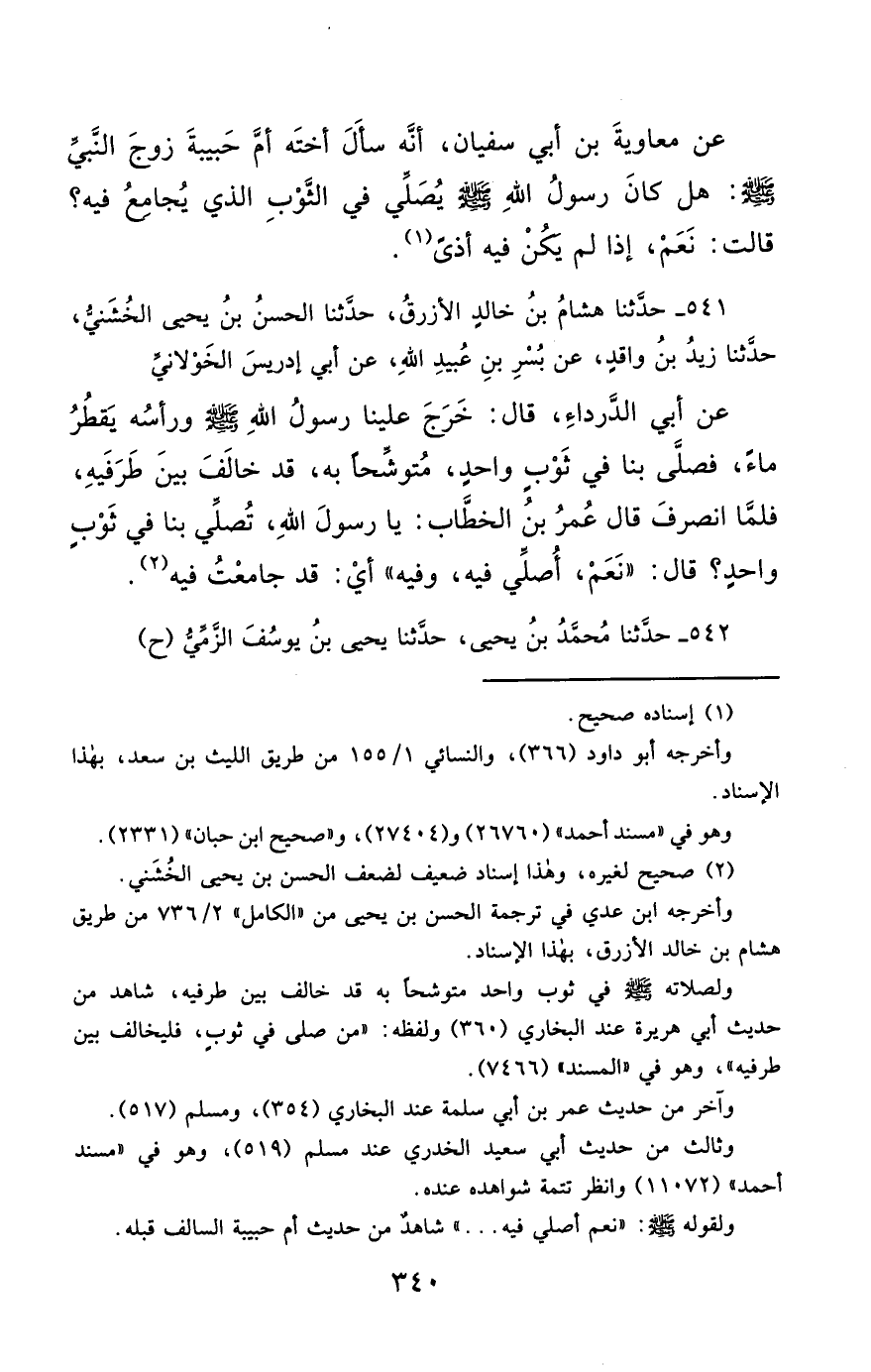 541- حَدَّثَنَا هِشَامُ بْنُ خَالِدٍ الأَزْرَقُ ، حَدَّثَنَا الْحَسَنُ بْنُ يَحْيَى الْخُشَنِيُّ ، حَدَّثَنَا زَيْدُ بْنُ وَاقِدٍ ، عَنْ بُسْرِ بْنِ عُبَيْدِ اللهِ ، عَنْ أَبِي إِدْرِيسَ الْخَوْلاَنِيِّ ، عَنْ أَبِي الدَّرْدَاءِ , قَالَ : خَرَجَ عَلَيْنَا رَسُولُ اللهِ صَلَّى الله عَليْهِ وسَلَّمَ وَرَأْسُهُ يَقْطُرُ مَاءً ، فَصَلَّى بِنَا فِي ثَوْبٍ وَاحِدٍ مُتَوَشِّحًا بِهِ ، قَدْ خَالَفَ بَيْنَ طَرَفَيْهِ ، فَلَمَّا انْصَرَفَ , قَالَ عُمَرُ بْنُ الْخَطَّابِ : يَا رَسُولَ اللهِ ، تُصَلِّي بِنَا فِي ثَوْبٍ وَاحِدٍ ؟ قَالَ : نَعَمْ ، أُصَلِّي فِيهِ , وَفِيهِ أَيْ : قَدْ جَامَعْتُ فِيهِ.