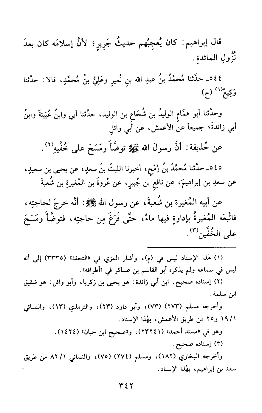 544- حَدَّثَنَا مُحَمَّدُ بْنُ عَبْدِ اللهِ بْنِ نُمَيْرٍ , وَعَلِيُّ بْنُ مُحَمَّدٍ ، قَالاَ : حَدَّثَنَا وَكِيعٌ (ح) وَحَدَّثَنَا أَبُو هَمَّامٍ الْوَلِيدُ بْنُ شُجَاعِ بْنِ الْوَلِيدِ ، حَدَّثَنَا أَبِي ، وَابْنُ عُيَيْنَةَ ، وَابْنُ أَبِي زَائِدَةَ ؛ جَمِيعًا عَنِ الأَعْمَشِ ، عَنْ أَبِي وَائِلٍ ، عَنْ حُذَيْفَةَ , أَنَّ رَسُولَ اللهِ صَلَّى الله عَليْهِ وسَلَّمَ تَوَضَّأَ وَمَسَحَ عَلَى خُفَّيْهِ.
