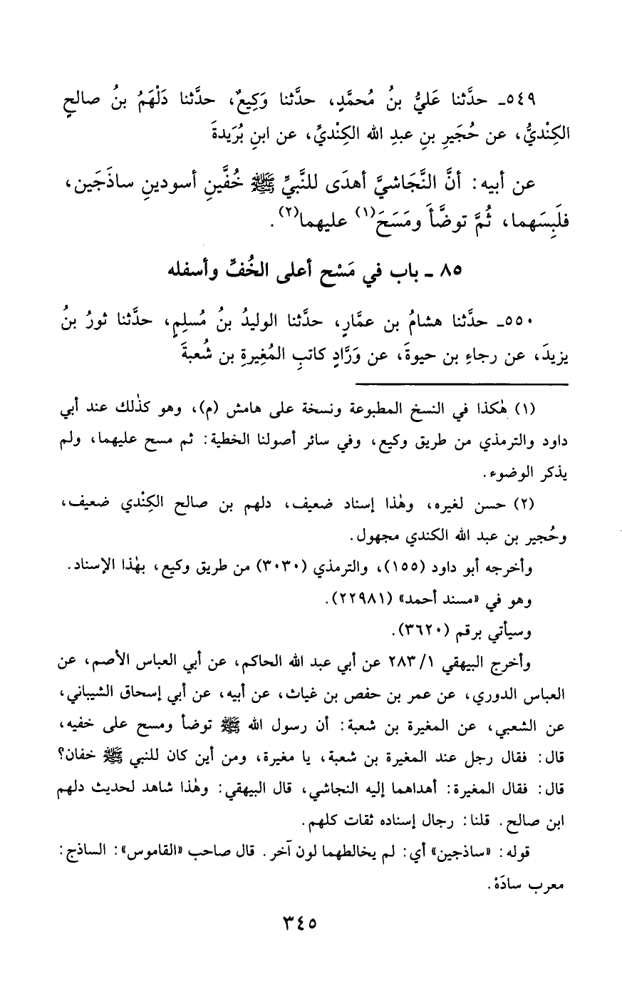 549- حَدَّثَنَا عَلِيُّ بْنُ مُحَمَّدٍ ، حَدَّثَنَا وَكِيعٌ ، حَدَّثَنَا دَلْهَمُ بْنُ صَالِحٍ الْكِنْدِيُّ ، عَنْ حُجَيْرِ بْنِ عَبْدِ اللهِ الْكِنْدِيِّ ، عَنِ ابْنِ بُرَيْدَةَ ، عَنْ أَبِيهِ ؛ أَنَّ النَّجَاشِيَّ أَهْدَى لِلنَّبِيِّ صَلَّى الله عَليْهِ وسَلَّمَ خُفَّيْنِ أَسْوَدَيْنِ سَاذَجَيْنِ ، فَلَبِسَهُمَا ، ثُمَّ تَوَضَّأَ وَمَسَحَ عَلَيْهِمَا.