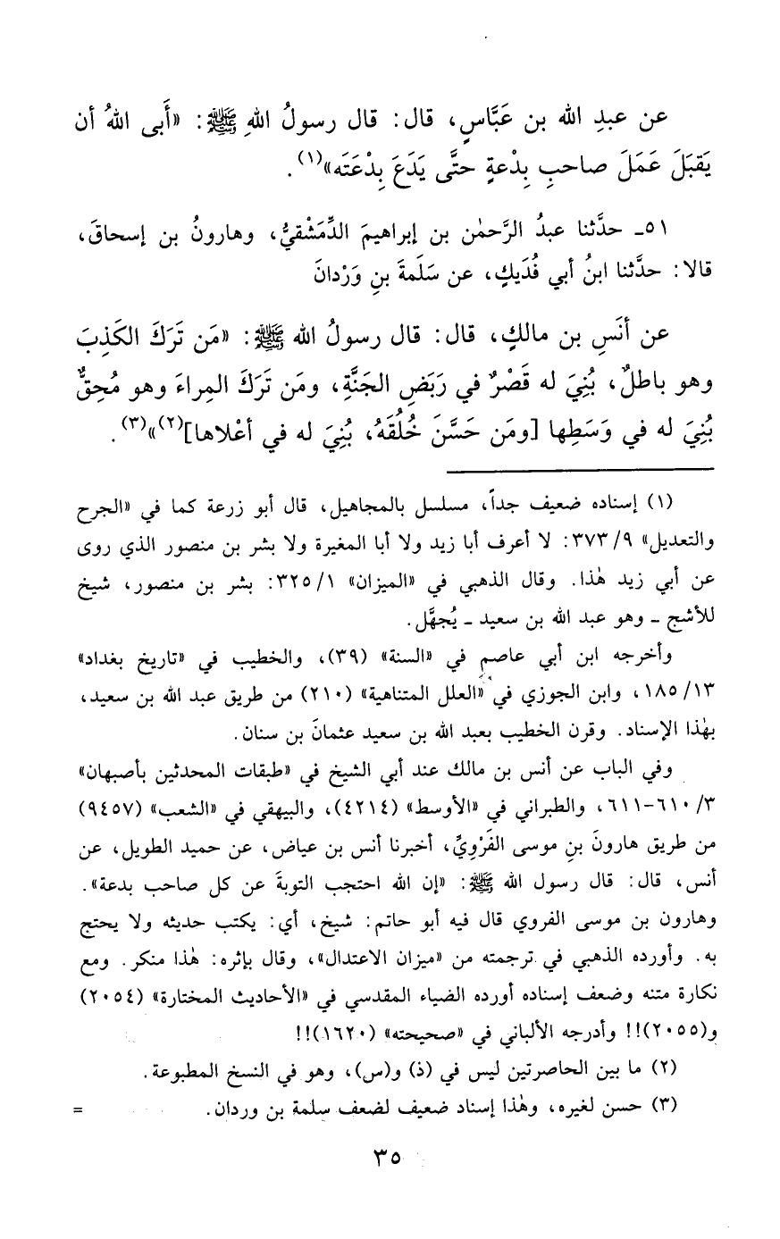 51- حَدَّثَنَا عَبْدُ الرَّحْمَنِ بْنُ إِبْرَاهِيمَ الدِّمَشْقِيُّ ، وَهَارُونُ بْنُ إِسْحَاقَ ، قَالاَ : حَدَّثَنَا ابْنُ أَبِي فُدَيْكٍ ، عَنْ سَلَمَةَ بْنِ وَرْدَانَ ، عَنْ أَنَسِ بْنِ مَالِكٍ ، قَالَ : قَالَ رَسُولُ اللهِ صَلَّى الله عَليْهِ وسَلَّمَ : مَنْ تَرَكَ الْكَذِبَ وَهُوَ بَاطِلٌ ، بُنِيَ لَهُ قَصْرٌ فِي رَبَضِ الْجَنَّةِ ، وَمَنْ تَرَكَ الْمِرَاءَ وَهُوَ مُحِقٌّ ، بُنِيَ لَهُ فِي وَسَطِهَا ، وَمَنْ حَسَّنَ خُلُقَةُ ، بُنِيَ لَهُ فِي أَعْلاَهَا.