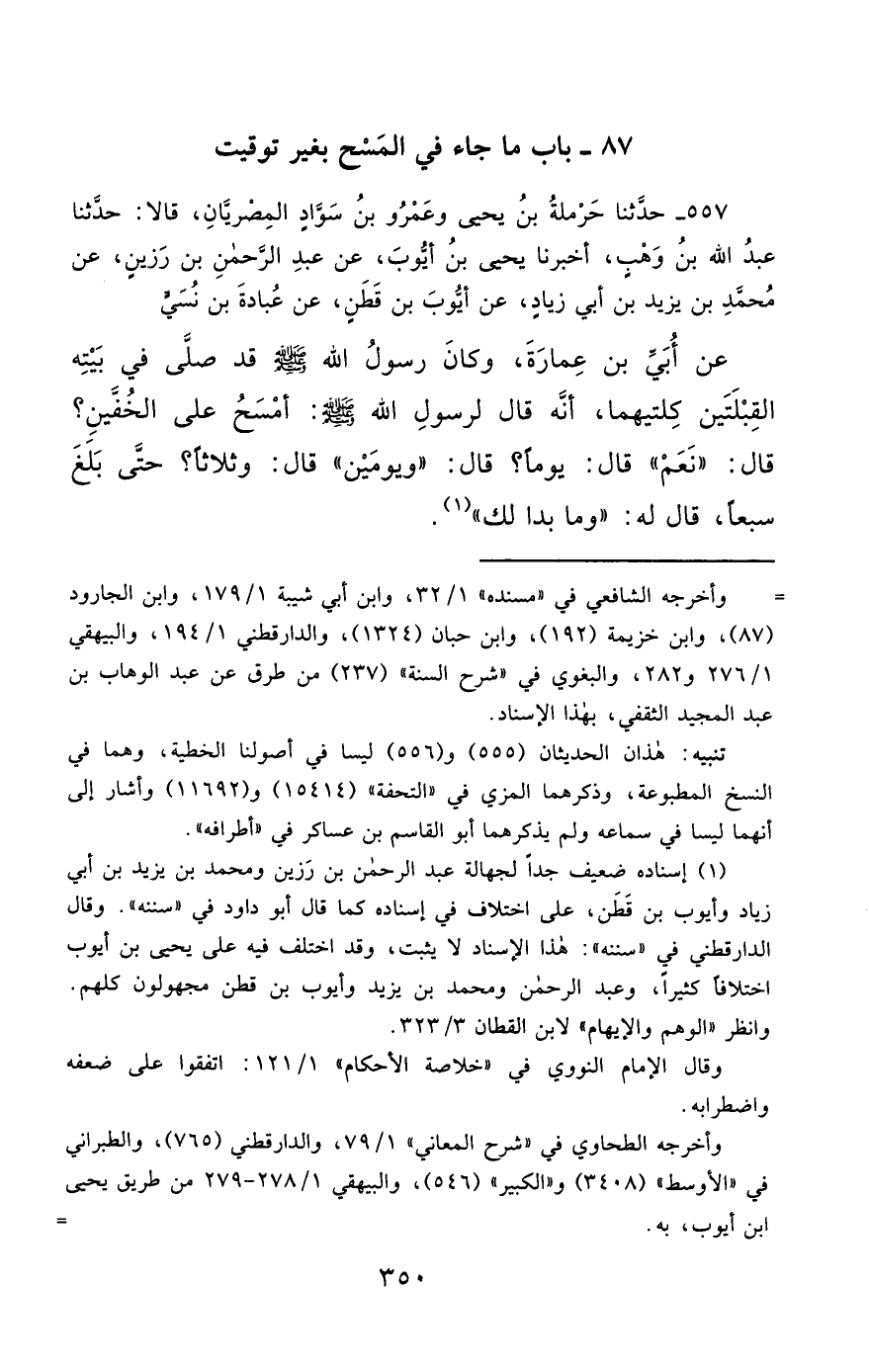 557- حَدَّثَنَا حَرْمَلَةُ بْنُ يَحْيَى , وَعَمْرُو بْنُ سَوَّادٍ الْمِصْرِيَّانِ ، قَالاَ : حَدَّثَنَا عَبْدُ اللهِ بْنُ وَهْبٍ ، أَخْبَرَنَا يَحْيَى بْنُ أَيُّوبَ ، عَنْ عَبْدِ الرَّحْمَنِ بْنِ رَزِينٍ ، عَنْ مُحَمَّدِ بْنِ يَزِيدَ بْنِ أَبِي زِيَادٍ ، عَنْ أَيُّوبَ بْنِ قَطَنٍ ، عَنْ عُبَادَةَ بْنِ نُسَيٍّ ، عَنْ أُبَيِّ بْنِ عِمَارَةَ ، وَكَانَ رَسُولُ اللهِ صَلَّى الله عَليْهِ وسَلَّمَ قَدْ صَلَّى فِي بَيْتِهِ الْقِبْلَتَيْنِ كِلْتَيْهِمَا ، أَنَّهُ قَالَ لِرَسُولِ اللهِ صَلَّى الله عَليْهِ وسَلَّمَ : أَمْسَحُ عَلَى الْخُفَّيْنِ ؟ قَالَ : نَعَمْ , قَالَ : يَوْمًا ؟ قَالَ : وَيَوْمَيْنِ , قَالَ : وَثَلاَثًا ؟ حَتَّى بَلَغَ سَبْعًا , قَالَ لَهُ : وَمَا بَدَا لَكَ.