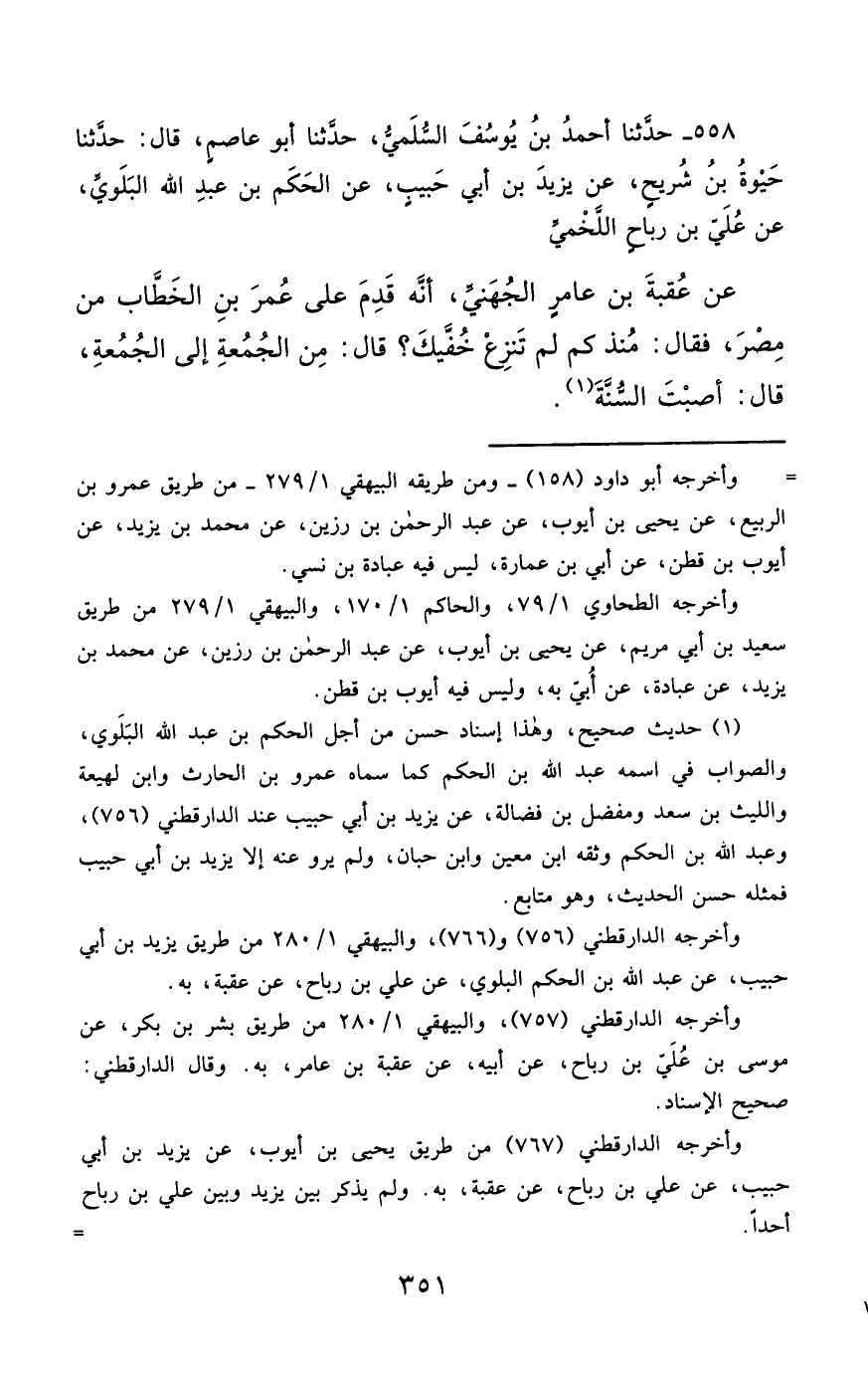 558- حَدَّثَنَا أَحْمَدُ بْنُ يُوسُفَ السُّلَمِيُّ ، حَدَّثَنَا أَبُو عَاصِمٍ ، حَدَّثَنَا حَيْوَةُ بْنُ شُرَيْحٍ ، عَنْ يَزِيدَ بْنِ أَبِي حَبِيبٍ ، عَنِ الْحَكَمِ بْنِ عَبْدِ اللهِ الْبَلَوِيِّ ، عَنْ عُليِّ بْنِ رَبَاحٍ اللَّخْمِيِّ ، عَنْ عُقْبَةَ بْنِ عَامِرٍ الْجُهَنِيِّ ، أَنَّهُ قَدِمَ عَلَى عُمَرَ بْنِ الْخَطَّابِ مِنْ مِصْرَ , فَقَالَ : مُنْذُ كَمْ لَمْ تَنْزِعْ خُفَّيْكَ ؟ قَالَ : مِنَ الْجُمُعَةِ إِلَى الْجُمُعَةِ ، قَالَ : أَصَبْتَ السُّنَّةَ.