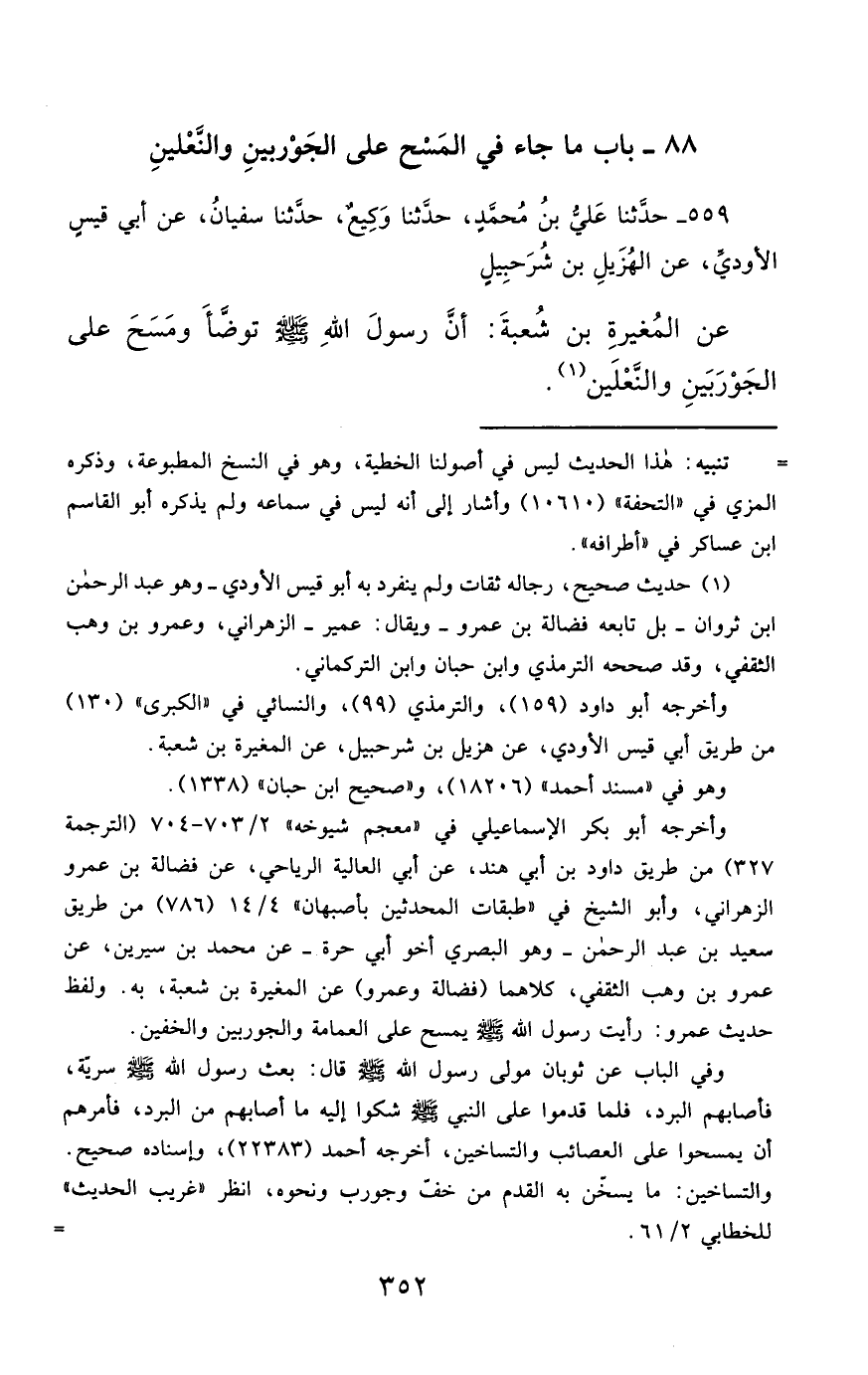 559- حَدَّثَنَا عَلِيُّ بْنُ مُحَمَّدٍ ، حَدَّثَنَا وَكِيعٌ ، حَدَّثَنَا سُفْيَانُ ، عَنْ أَبِي قَيْسٍ الأَوْدِيِّ ، عَنِ الْهُزَيْلِ بْنِ شُرَحْبِيلَ ، عَنِ الْمُغِيرَةِ بْنِ شُعْبَةَ ، أَنَّ رَسُولَ اللهِ صَلَّى الله عَليْهِ وسَلَّمَ تَوَضَّأَ , وَمَسَحَ عَلَى الْجَوْرَبَيْنِ وَالنَّعْلَيْنِ.
