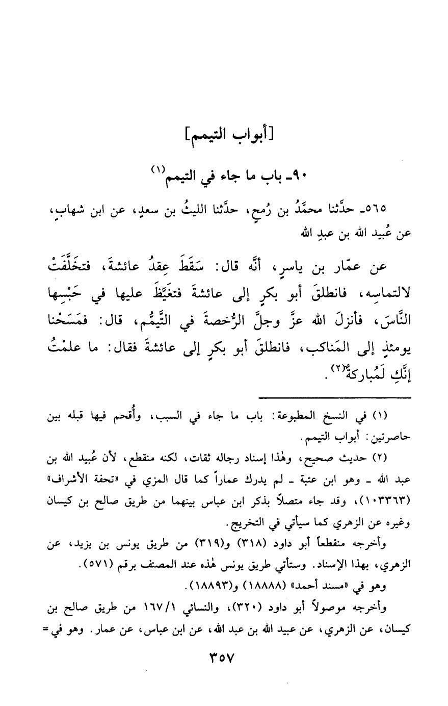 565- حَدَّثَنَا مُحَمَّدُ بْنُ رُمْحٍ ، حَدَّثَنَا اللَّيْثُ بْنُ سَعْدٍ ، عَنِ ابْنِ شِهَابٍ ، عَنْ عُبَيْدِ اللهِ بْنِ عَبْدِ اللهِ ، عَنْ عَمَّارِ بْنِ يَاسِرٍ ، أَنَّهُ قَالَ : سَقَطَ عِقْدُ عَائِشَةَ ، فَتَخَلَّفَتْ لاِلْتِمَاسِهِ ، فَانْطَلَقَ أَبُو بَكْرٍ إِلَى عَائِشَةَ ، فَتَغَيَّظَ عَلَيْهَا فِي حَبْسِهَا النَّاسَ ، فَأَنْزَلَ اللَّهُ عَزَّ وَجَلَّ الرُّخْصَةَ فِي التَّيَمُّمِ ، قَالَ : فَمَسَحْنَا يَوْمَئِذٍ إِلَى الْمَنَاكِبِ ، فَانْطَلَقَ أَبُو بَكْرٍ إِلَى عَائِشَةَ , فَقَالَ : مَا عَلِمْتُ إِنَّكِ لَمُبَارَكَةٌ.