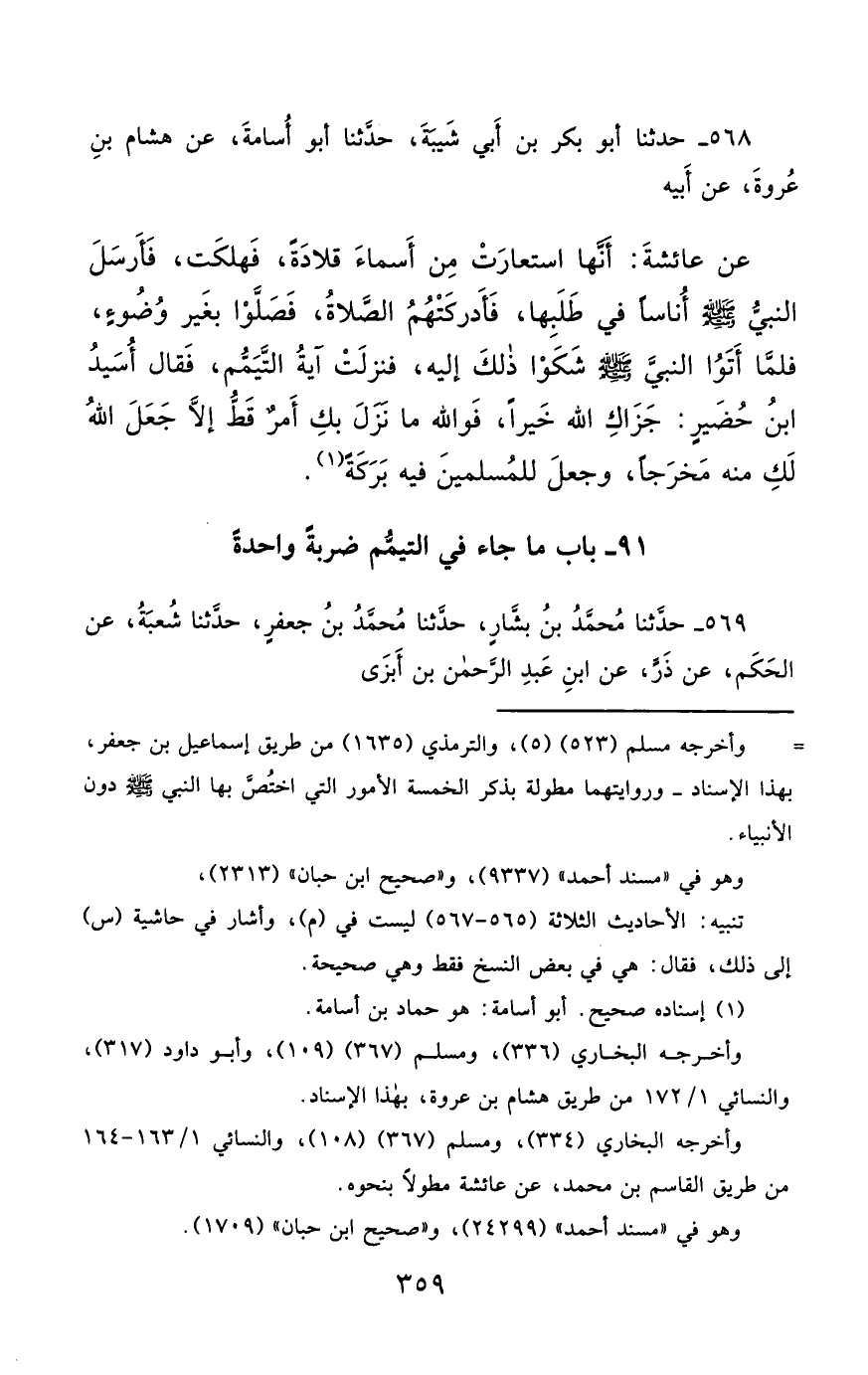 568- حَدَّثَنَا أَبُو بَكْرِ بْنُ أَبِي شَيْبَةَ ، حَدَّثَنَا أَبُو أُسَامَةَ ، عَنْ هِشَامِ بْنِ عُرْوَةَ ، عَنْ أَبِيهِ ، عَنْ عَائِشَةَ , أَنَّهَا اسْتَعَارَتْ مِنْ أَسْمَاءَ قِلاَدَةً ، فَهَلَكَتْ , فَأَرْسَلَ النَّبِيُّ صَلَّى الله عَليْهِ وسَلَّمَ أُنَاسًا فِي طَلَبِهَا ، فَأَدْرَكَتْهُمُ الصَّلاَةُ ، فَصَلَّوْا بِغَيْرِ وُضُوءٍ ، فَلَمَّا أَتَوُا النَّبِيَّ صَلَّى الله عَليْهِ وسَلَّمَ , شَكَوْا ذَلِكَ إِلَيْهِ ، فَنَزَلَتْ آيَةُ التَّيَمُّمِ , فَقَالَ أُسَيْدُ بْنُ حُضَيْرٍ : جَزَاكِ اللَّهُ خَيْرًا ، فَوَاللَّهِ مَا نَزَلَ بِكِ أَمْرٌ قَطُّ ، إِلاَّ جَعَلَ اللَّهُ لَكِ مِنْهُ مَخْرَجًا ، وَجَعَلَ لِلْمُسْلِمِينَ فِيهِ بَرَكَةً.