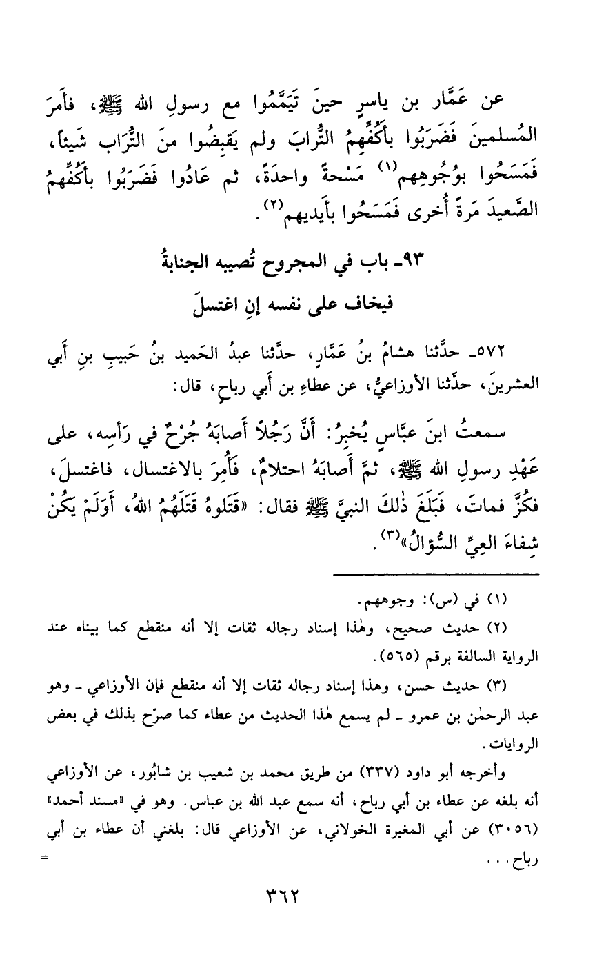 572- حَدَّثَنَا هِشَامُ بْنُ عَمَّارٍ ، حَدَّثَنَا عَبْدُ الْحَمِيدِ بْنُ حَبِيبِ بْنِ أَبِي الْعِشْرِينِ ، حَدَّثَنَا الأَوْزَاعِيُّ ، عَنْ عَطَاءِ بْنِ أَبِي رَبَاحٍ , قَالَ : سَمِعْتُ ابْنَ عَبَّاسٍ يُخْبِرُ , أَنَّ رَجُلاً أَصَابَهُ جُرْحٌ فِي رَأْسِهِ ، عَلَى عَهْدِ رَسُولِ اللهِ صَلَّى الله عَليْهِ وسَلَّمَ ، ثُمَّ أَصَابَهُ احْتِلاَمٌ ، فَأُمِرَ بِالاِغْتِسَالِ ، فَاغْتَسَلَ ، فَكُزَّ , فَمَاتَ ، فَبَلَغَ ذَلِكَ النَّبِيَّ صَلَّى الله عَليْهِ وسَلَّمَ , فَقَالَ : قَتَلُوهُ ، قَتَلَهُمُ اللَّهُ ، أَوَلَمْ يَكُنْ شِفَاءَ الْعِيِّ السُّؤَالُ.