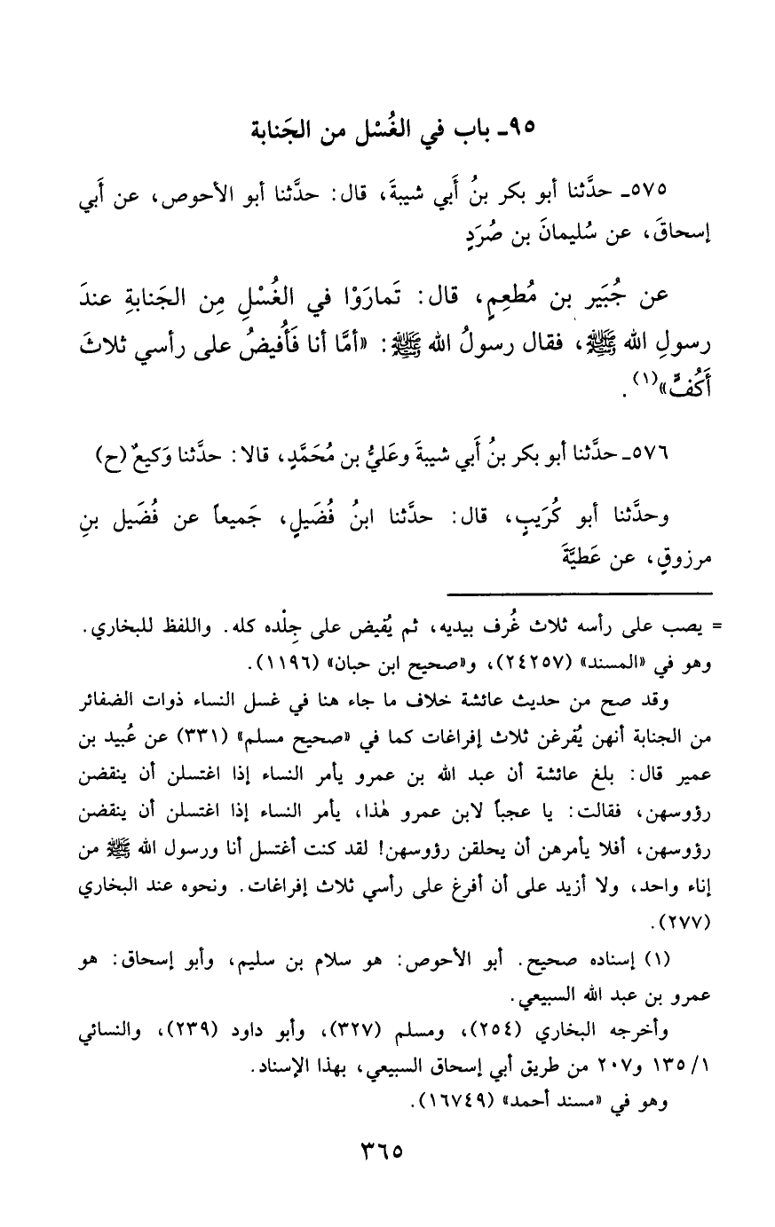 575- حَدَّثَنَا أَبُو بَكْرِ بْنُ أَبِي شَيْبَةَ ، قَالَ : حَدَّثَنَا أَبُو الأَحْوَصِ ، عَنْ أَبِي إِسْحَاقَ ، عَنْ سُلَيْمَانَ بْنِ صُرَدٍ ، عَنْ جُبَيْرِ بْنِ مُطْعِمٍ ، قَالَ : تَمَارَوْا فِي الْغُسْلِ مِنَ الْجَنَابَةِ عِنْدَ رَسُولِ اللهِ صَلَّى الله عَليْهِ وسَلَّمَ ، فَقَالَ رَسُولُ اللهِ صَلَّى الله عَليْهِ وسَلَّمَ : أَمَّا أَنَا ، فَأُفِيضُ عَلَى رَأْسِي ثَلاَثَ أَكُفٍّ.