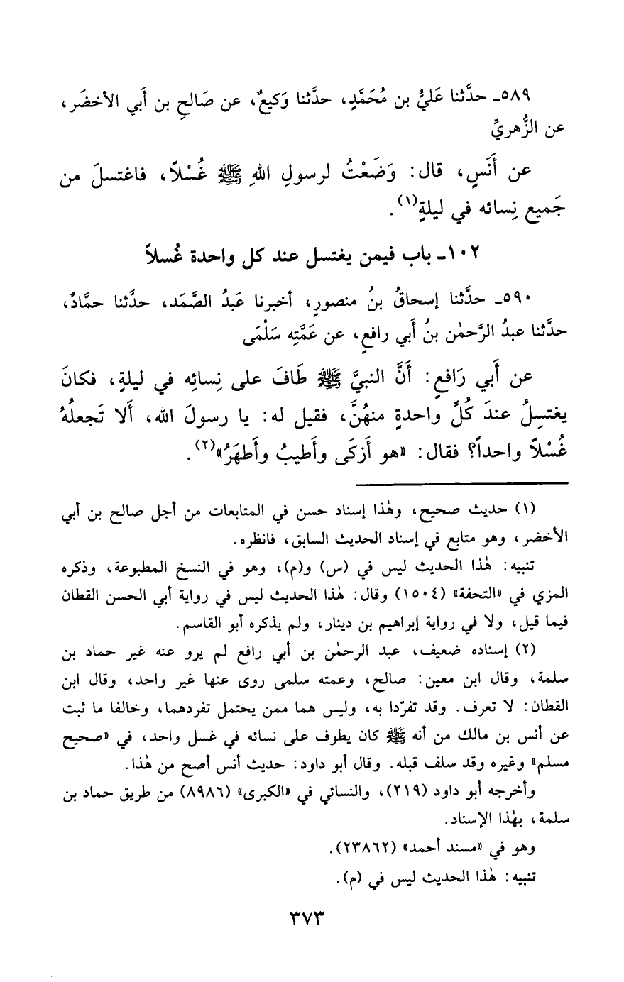 589- حَدَّثَنَا عَلِيُّ بْنُ مُحَمَّدٍ ، حَدَّثَنَا وَكِيعٌ ، عَنْ صَالِحِ بْنِ أَبِي الأَخْضَرِ ، عَنِ الزُّهْرِيِّ ، عَنْ أَنَسٍ ، قَالَ : وَضَعْتُ لِرَسُولِ اللهِ صَلَّى الله عَليْهِ وسَلَّمَ غُسْلاً , فَاغْتَسَلَ مِنْ جَمِيعِ نِسَائِهِ فِي لَيْلَةٍ.