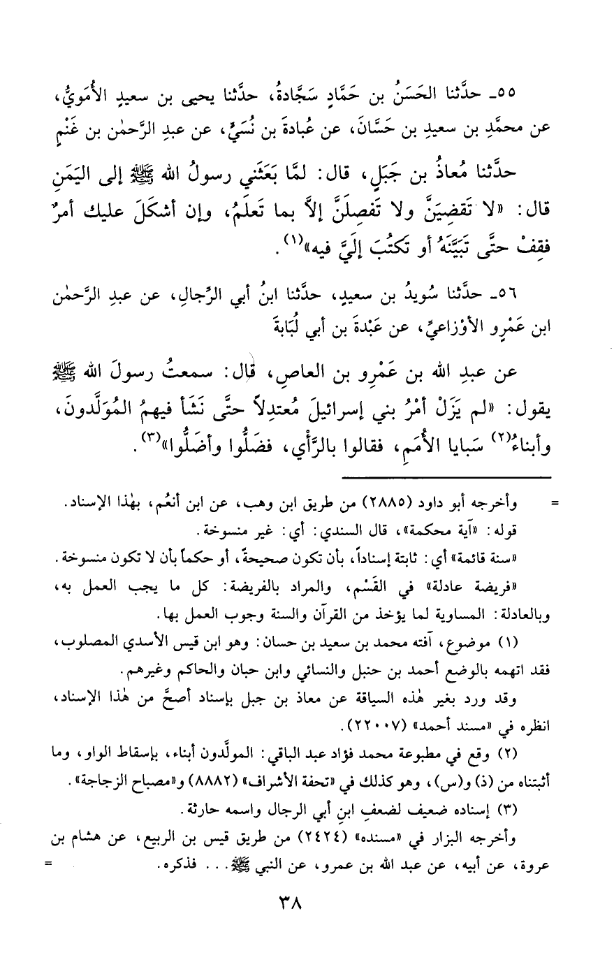 56- حَدَّثَنَا سُوَيْدُ بْنُ سَعِيدٍ ، حَدَّثَنَا ابْنُ أَبِي الرِّجَالِ ، عَنْ عَبْدِ الرَّحْمَنِ بْنِ عَمْرٍو الأَوْزَاعِيِّ ، عَنْ عَبْدَةَ بْنِ أَبِي لُبَابَةَ ، عَنْ عَبْدِ اللهِ بْنِ عَمْرِو بْنِ الْعَاصِ ، قَالَ : سَمِعْتُ رَسُولَ اللهِ صَلَّى الله عَليْهِ وسَلَّمَ يَقُولُ : لَمْ يَزَلْ أَمْرُ بَنِي إِسْرَائِيلَ مُعْتَدِلاً حَتَّى نَشَأَ فِيهِمُ الْمُوَلَّدُونَ ، وَأَبْنَاءُ سَبَايَا الأُمَمِ ، فَقَالُوا بِالرَّأْيِ ، فَضَلُّوا وَأَضَلُّوا.
