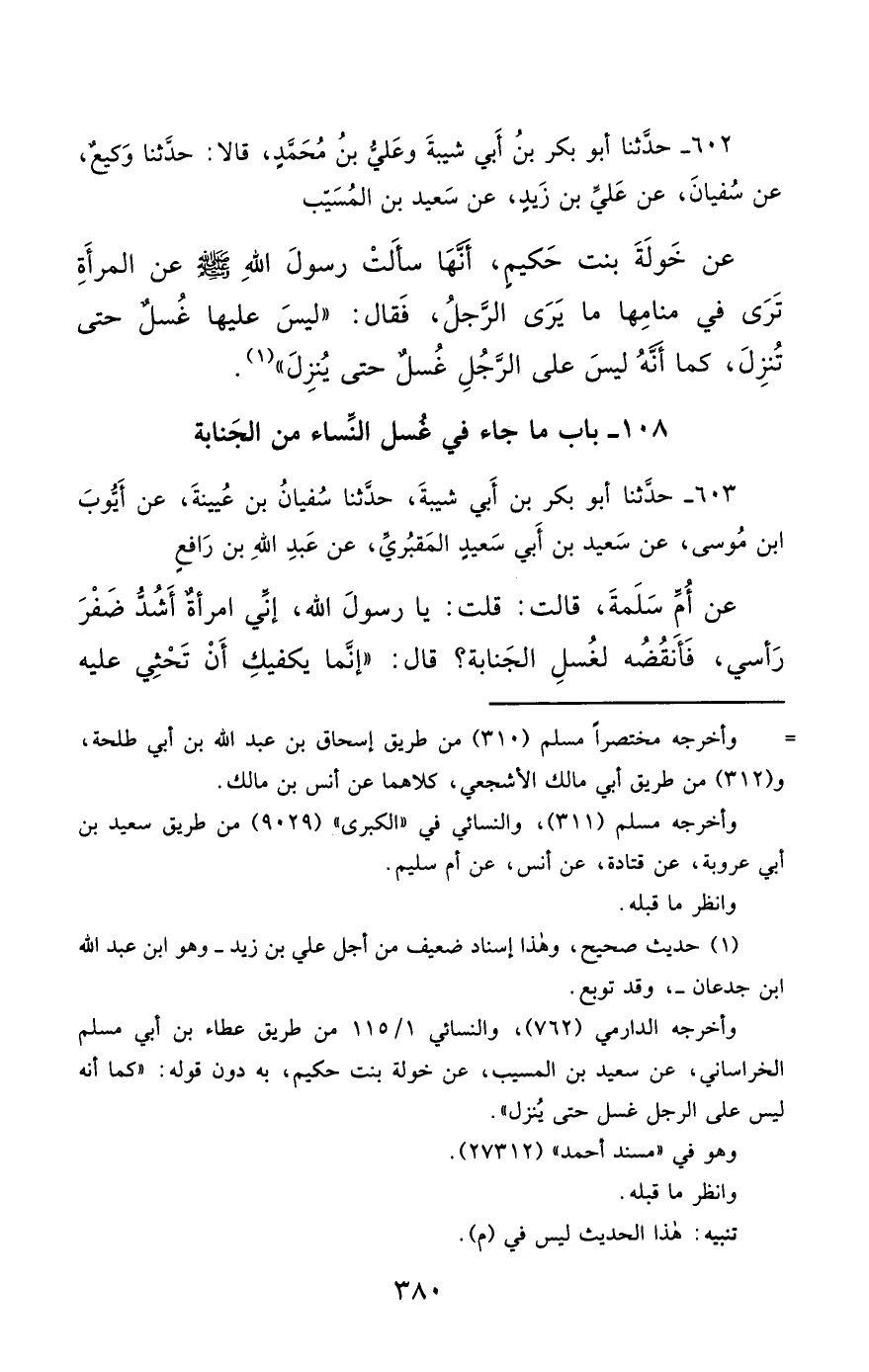 603- حَدَّثَنَا أَبُو بَكْرِ بْنُ أَبِي شَيْبَةَ ، حَدَّثَنَا سُفْيَانُ بْنُ عُيَيْنَةَ ، عَنْ أَيُّوبَ بْنِ مُوسَى ، عَنْ سَعِيدِ بْنِ أَبِي سَعِيدٍ الْمَقْبُرِيِّ ، عَنْ عَبْدِ اللهِ بْنِ رَافِعٍ ، عَنْ أُمِّ سَلَمَةَ , قَالَتْ : قُلْتُ : يَا رَسُولَ اللهِ ، إِنِّي امْرَأَةٌ أَشُدُّ ضَفْرَ رَأْسِي ، فَأَنْقُضُهُ لِغُسْلِ الْجَنَابَةِ ؟ قَالَ : إِنَّمَا يَكْفِيكِ أَنْ تَحْثِي عَلَيْهِ ثَلاَثَ حَثَيَاتٍ مِنْ مَاءٍ ، ثُمَّ تُفِيضِي عَلَيْكِ مِنَ الْمَاءِ ، فَتَطْهُرِينَ ، أَوْ قَالَ ، فَإِذَا أَنْتِ قَدْ طَهُرْتِ.