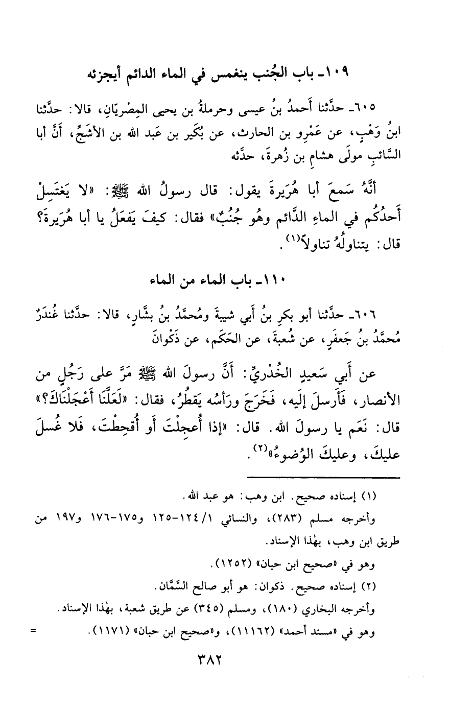 605- حَدَّثَنَا أَحْمَدُ بْنُ عِيسَى ، وَحَرْمَلَةُ بْنُ يَحْيَى الْمِصْرِيَّانِ ، قَالاَ : حَدَّثَنَا ابْنُ وَهْبٍ ، عَنْ عَمْرِو بْنِ الْحَارِثِ ، عَنْ بُكَيْرِ بْنِ عَبْدِ اللهِ بْنِ الأَشَجِّ , أَنَّ أَبَا السَّائِبِ , مَوْلَى هِشَامِ بْنِ زُهْرَةَ حَدَّثَهُ , أَنَّهُ سَمِعَ أَبَا هُرَيْرَةَ يَقُولُ : قَالَ رَسُولُ اللهِ صَلَّى الله عَليْهِ وسَلَّمَ : لاَ يَغْتَسِلْ أَحَدُكُمْ فِي الْمَاءِ الدَّائِمِ ، وَهُوَ جُنُبٌ , فَقَالَ : كَيْفَ يَفْعَلُ يَا أَبَا هُرَيْرَةَ ؟ فَقَالَ : يَتَنَاوَلُهُ تَنَاوُلاً.