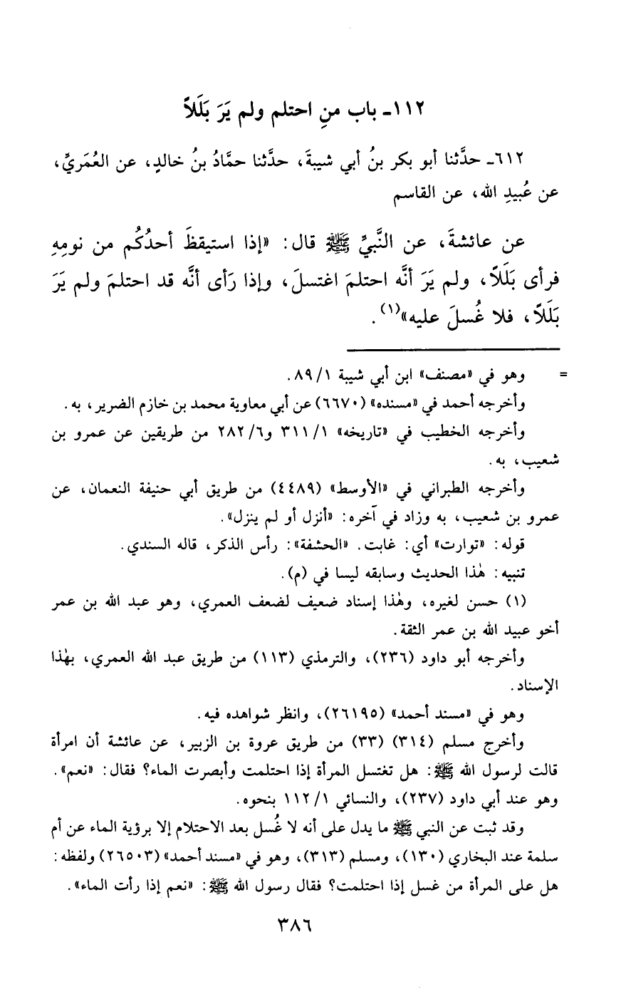 612- حَدَّثَنَا أَبُو بَكْرِ بْنُ أَبِي شَيْبَةَ ، حَدَّثَنَا حَمَّادُ بْنُ خَالِدٍ ، عَنِ الْعُمَرِيِّ ، عَنْ عُبَيْدِ اللهِ ، عَنِ الْقَاسِمِ ، عَنْ عَائِشَةَ ، عَنِ النَّبِيِّ صَلَّى الله عَليْهِ وسَلَّمَ قَالَ : إِذَا اسْتَيْقَظَ أَحَدُكُمْ مِنْ نَوْمِهِ ، فَرَأَى بَلَلاً ، وَلَمْ يَرَ أَنَّهُ احْتَلَمَ ، اغْتَسَلَ ، وَإِذَا رَأَى أَنَّهُ قَدِ احْتَلَمَ ، وَلَمْ يَرَ بَلَلاً ، فَلاَ غُسْلَ عَلَيْهِ.