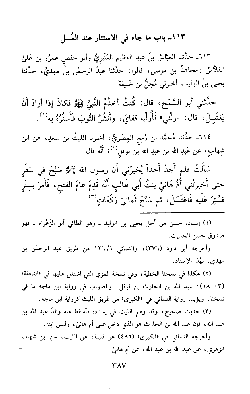 614- حَدَّثَنَا مُحَمَّدُ بْنُ رُمْحٍ الْمِصْرِيُّ ، أَخْبَرَنَا اللَّيْثُ بْنُ سَعْدٍ ، عَنِ ابْنِ شِهَابٍ ، عَنْ عَبْدِ اللهِ بْنِ الْحَارِثِ بْنِ نَوْفَلٍ (1)، أَنَّهُ قَالَ : سَأَلْتُ فَلَمْ أَجِدْ أَحَدًا يُخْبِرُنِي أَنَّ رَسُولَ اللهِ صَلَّى الله عَليْهِ وسَلَّمَ سَبَّحَ فِي سَفَرٍ ، حَتَّى أَخْبَرَتْنِي أُمُّ هَانِئٍ بِنْتُ أَبِي طَالِبٍ , أَنَّهُ قَدِمَ عَامَ الْفَتْحِ ، فَأَمَرَ بِسِتْرٍ ، فَسُتِرَ عَلَيْهِ ، فَاغْتَسَلَ ، ثُمَّ سَبَّحَ ثَمَانِيَ رَكَعَاتٍ.