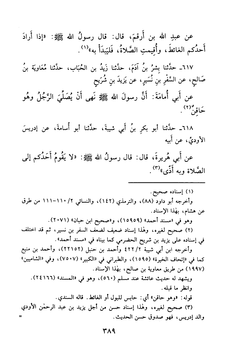 617- حَدَّثَنَا بِشْرُ بْنُ آدَمَ ، حَدَّثَنَا زَيْدُ بْنُ الْحُبَابِ ، حَدَّثَنَا مُعَاوِيَةُ بْنُ صَالِحٍ ، عَنِ السَّفْرِ بْنِ نُسَيْرٍ ، عَنْ يَزِيدَ بْنِ شُرَيْحٍ ، عَنْ أَبِي أُمَامَةَ , أَنَّ رَسُولَ اللهِ صَلَّى الله عَليْهِ وسَلَّمَ نَهَى أَنْ يُصَلِّيَ الرَّجُلُ وَهُوَ حَاقِنٌ.