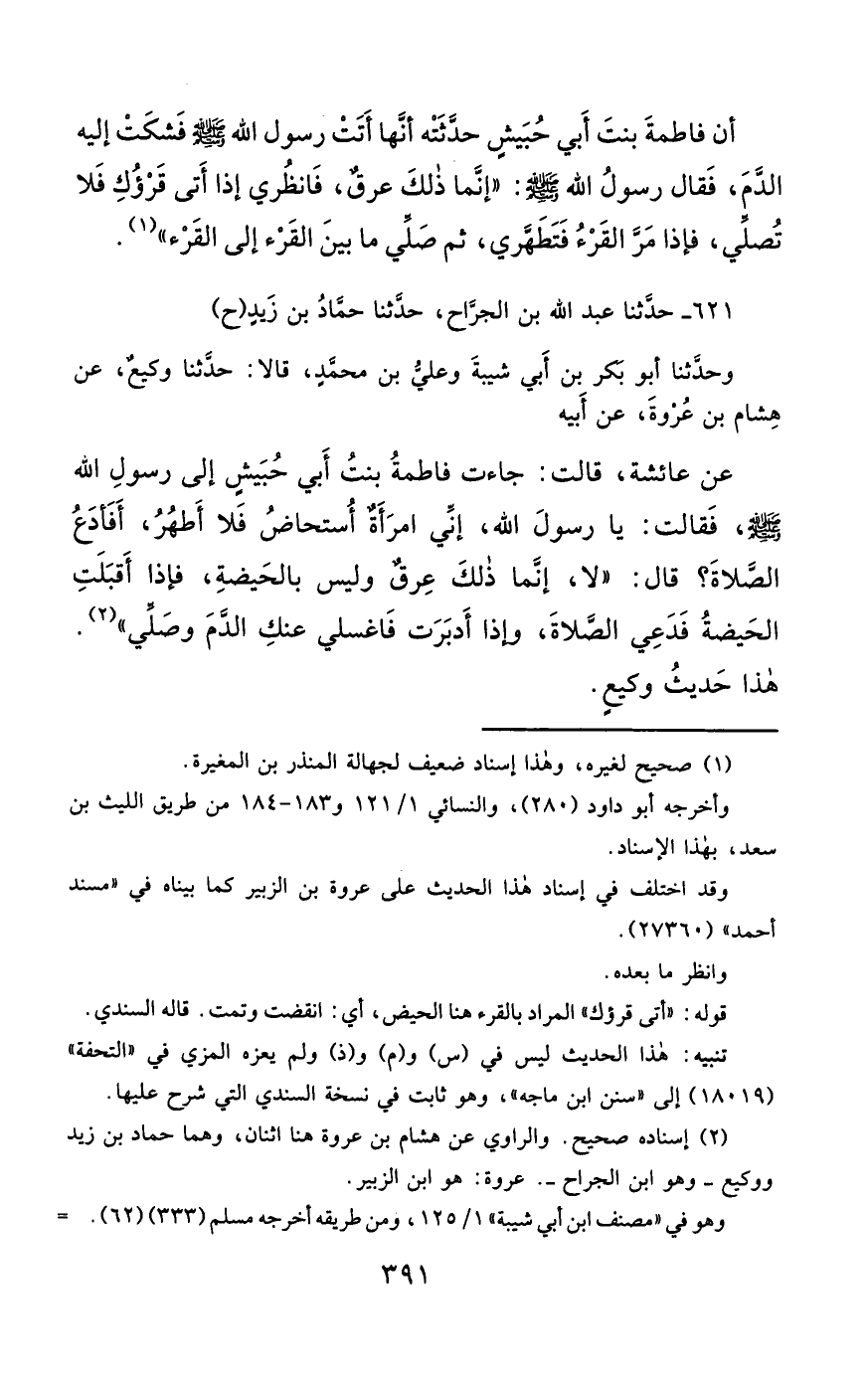 621- حَدَّثَنَا عَبْدُ اللهِ بْنُ الْجَرَّاحِ ، حَدَّثَنَا حَمَّادُ بْنُ زَيْدٍ (ح) وَحَدَّثَنَا أَبُو بَكْرِ بْنُ أَبِي شَيْبَةَ , وَعَلِيُّ بْنُ مُحَمَّدٍ ، قَالاَ : حَدَّثَنَا وَكِيعٌ ، عَنْ هِشَامِ بْنِ عُرْوَةَ ، عَنْ أَبِيهِ ، عَنْ عَائِشَةَ , قَالَتْ : جَاءَتْ فَاطِمَةُ بِنْتُ أَبِي حُبَيْشٍ إِلَى رَسُولِ اللهِ صَلَّى الله عَليْهِ وسَلَّمَ , فَقَالَتْ : يَا رَسُولَ اللهِ ، إِنِّي امْرَأَةٌ أُسْتَحَاضُ ، فَلاَ أَطْهُرُ ، أَفَأَدَعُ الصَّلاَةَ ، قَالَ : لاَ ، إِنَّمَا ذَلِكِ عِرْقٌ ، وَلَيْسَ بِالْحَيْضَةِ ، فَإِذَا أَقْبَلَتِ الْحَيْضَةُ ، فَدَعِي الصَّلاَةَ ، وَإِذَا أَدْبَرَتْ ، فَاغْسِلِي عَنْكِ الدَّمَ ، وَصَلِّي.