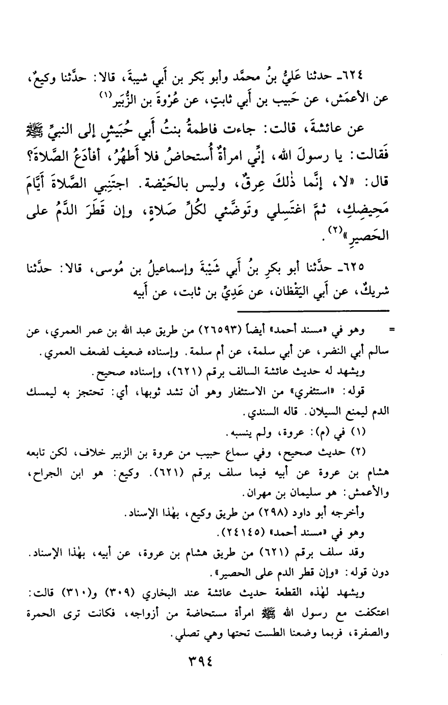 624- حَدَّثَنَا عَلِيُّ بْنُ مُحَمَّدٍ , وَأَبُو بَكْرِ بْنُ أَبِي شَيْبَةَ ، قَالاَ : حَدَّثَنَا وَكِيعٌ ، عَنِ الأَعْمَشِ ، عَنْ حَبِيبِ بْنِ أَبِي ثَابِتٍ ، عَنْ عُرْوَةَ بْنِ الزُّبَيْرِ ، عَنْ عَائِشَةَ , قَالَتْ : جَاءَتْ فَاطِمَةُ بِنْتُ أَبِي حُبَيْشٍ إِلَى النَّبِيِّ صَلَّى الله عَليْهِ وسَلَّمَ , فَقَالَتْ : يَا رَسُولَ اللهِ ، إِنِّي امْرَأَةٌ أُسْتَحَاضُ ، فَلاَ أَطْهُرُ ، أَفَأَدَعُ الصَّلاَةَ ؟ قَالَ : لاَ ، إِنَّمَا ذَلِكِ عِرْقٌ , وَلَيْسَ بِالْحَيْضَةِ ، اجْتَنِبِي الصَّلاَةَ أَيَّامَ مَحِيضِكِ ، ثُمَّ اغْتَسِلِي ، وَتَوَضَّئِي لِكُلِّ صَلاَةٍ ، وَإِنْ قَطَرَ الدَّمُ عَلَى الْحَصِيرِ.