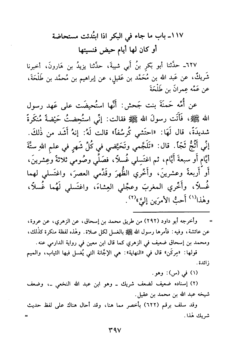 627- حَدَّثَنَا أَبُو بَكْرِ بْنُ أَبِي شَيْبَةَ ، حَدَّثَنَا يَزِيدُ بْنُ هَارُونَ ، أَخْبَرَنَا شَرِيكٌ ، عَنْ عَبْدِ اللهِ بْنِ مُحَمَّدِ بْنِ عَقِيلٍ ، عَنْ إِبْرَاهِيمَ بْنِ مُحَمَّدِ بْنِ طَلْحَةَ ، عَنْ عَمِّهِ عِمْرَانَ بْنِ طَلْحَةَ ، عَنْ أُمِّهِ حَمْنَةَ بِنْتِ جَحْشٍ , أَنَّهَا اسْتُحِيضَتْ عَلَى عَهْدِ رَسُولِ اللهِ صَلَّى الله عَليْهِ وسَلَّمَ ، فَأَتَتْ رَسُولَ اللهِ صَلَّى الله عَليْهِ وسَلَّمَ , فَقَالَتْ : إِنِّي اسْتُحِضْتُ حَيْضَةً مُنْكَرَةً شَدِيدَةً ، قَالَ لَهَا : احْتَشِي كُرْسُفًا , قَالَتْ لَهُ : إِنَّهُ أَشَدُّ مِنْ ذَلِكَ ، إِنِّي أَثُجُّ ثَجًّا ، قَالَ : تَلَجَّمِي ، وَتَحَيَّضِي فِي كُلِّ شَهْرٍ فِي عِلْمِ اللهِ سِتَّةَ أَيَّامٍ ، أَوْ سَبْعَةَ أَيَّامٍ ، ثُمَّ اغْتَسِلِي غُسْلاً ، فَصَلِّي ، وَصُومِي ثَلاَثَةً وَعِشْرِينَ ، أَوْ أَرْبَعَةً وَعِشْرِينَ ، وَأَخِّرِي الظُّهْرَ ، وَقَدِّمِي الْعَصْرَ ، وَاغْتَسِلِي لَهُمَا غُسْلاً ، وَأَخِّرِي الْمَغْرِبَ ، وَعَجِّلِي الْعِشَاءَ ، وَاغْتَسِلِي لَهُمَا غُسْلاً ، وَهَذَا أَحَبُّ الأَمْرَيْنِ إِلَيَّ.