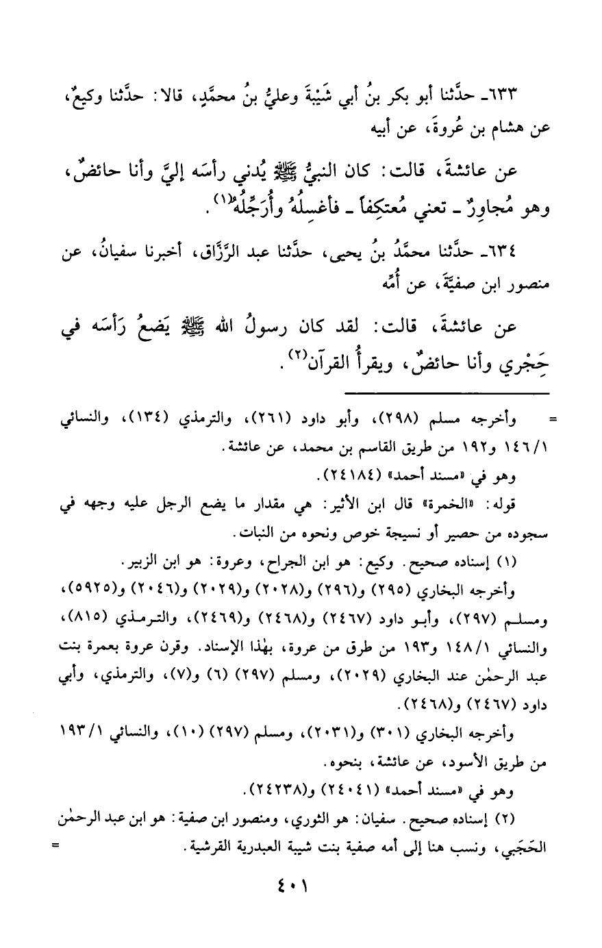633- حَدَّثَنَا أَبُو بَكْرِ بْنُ أَبِي شَيْبَةَ , وَعَلِيُّ بْنُ مُحَمَّدٍ ، قَالاَ : حَدَّثَنَا وَكِيعٌ ، عَنْ هِشَامِ بْنِ عُرْوَةَ ، عَنْ أَبِيهِ ، عَنْ عَائِشَةَ ، قَالَتْ : كَانَ النَّبِيُّ صَلَّى الله عَليْهِ وسَلَّمَ يُدْنِي رَأْسَهُ إِلَيَّ وَأَنَا حَائِضٌ ، وَهُوَ مُجَاوِرٌ ، تَعْنِي مُعْتَكِفًا ، فَأَغْسِلُهُ ، وَأُرَجِّلُهُ.