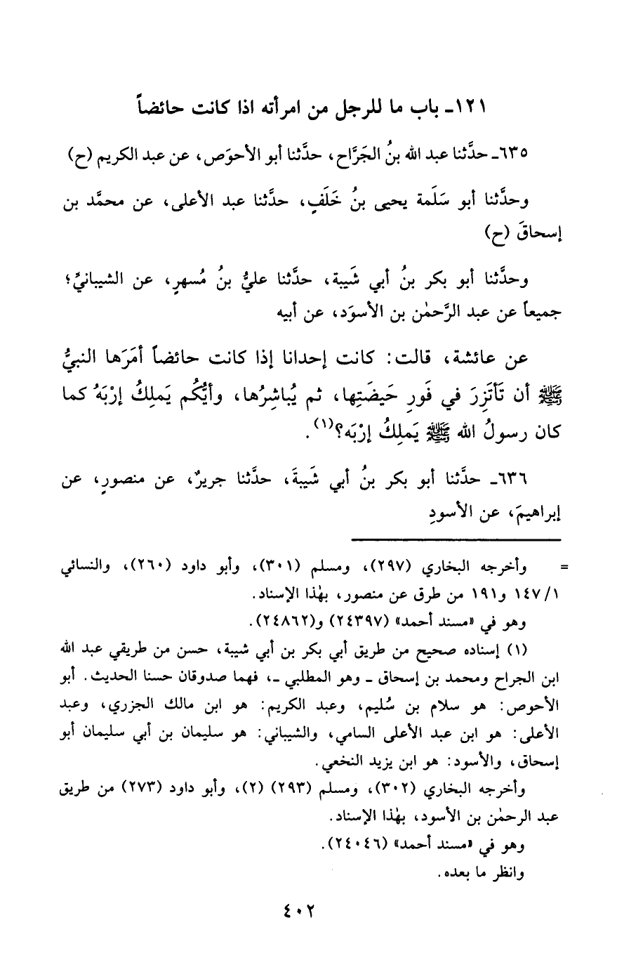 635- حَدَّثَنَا عَبْدُ اللهِ بْنُ الْجَرَّاحِ ، حَدَّثَنَا أَبُو الأَحْوَصِ ، عَنْ عَبْدِ الْكَرِيمِ (ح) وَحَدَّثَنَا أَبُو سَلَمَةَ يَحْيَى بْنُ خَلَفٍ ، حَدَّثَنَا عَبْدُ الأَعْلَى ، عَنْ مُحَمَّدِ بْنِ إِسْحَاقَ (ح) وَحَدَّثَنَا أَبُو بَكْرِ بْنُ أَبِي شَيْبَةَ ، حَدَّثَنَا عَلِيُّ بْنُ مُسْهِرٍ ، عَنِ الشَّيْبَانِيِّ ؛ جَمِيعًا عَنْ عَبْدِ الرَّحْمَنِ بْنِ الأَسْوَدِ ، عَنْ أَبِيهِ ، عَنْ عَائِشَةَ ، قَالَتْ : كَانَتْ إِحْدَانَا إِذَا كَانَتْ حَائِضًا ، أَمَرَهَا النَّبِيُّ صَلَّى الله عَليْهِ وسَلَّمَ أَنْ تَأْتَزِرَ فِي فَوْرِ حَيْضَتِهَا ، ثُمَّ يُبَاشِرُهَا ، وأيُّكمْ يَمْلِكُ إِرْبَهُ , كَمَا كانَ رَسُولُ اللهِ صَلَّى اللَّهُ عليْهِ وَسلَّمَ يَمْلِكُ إِرْبَهُ ؟.
