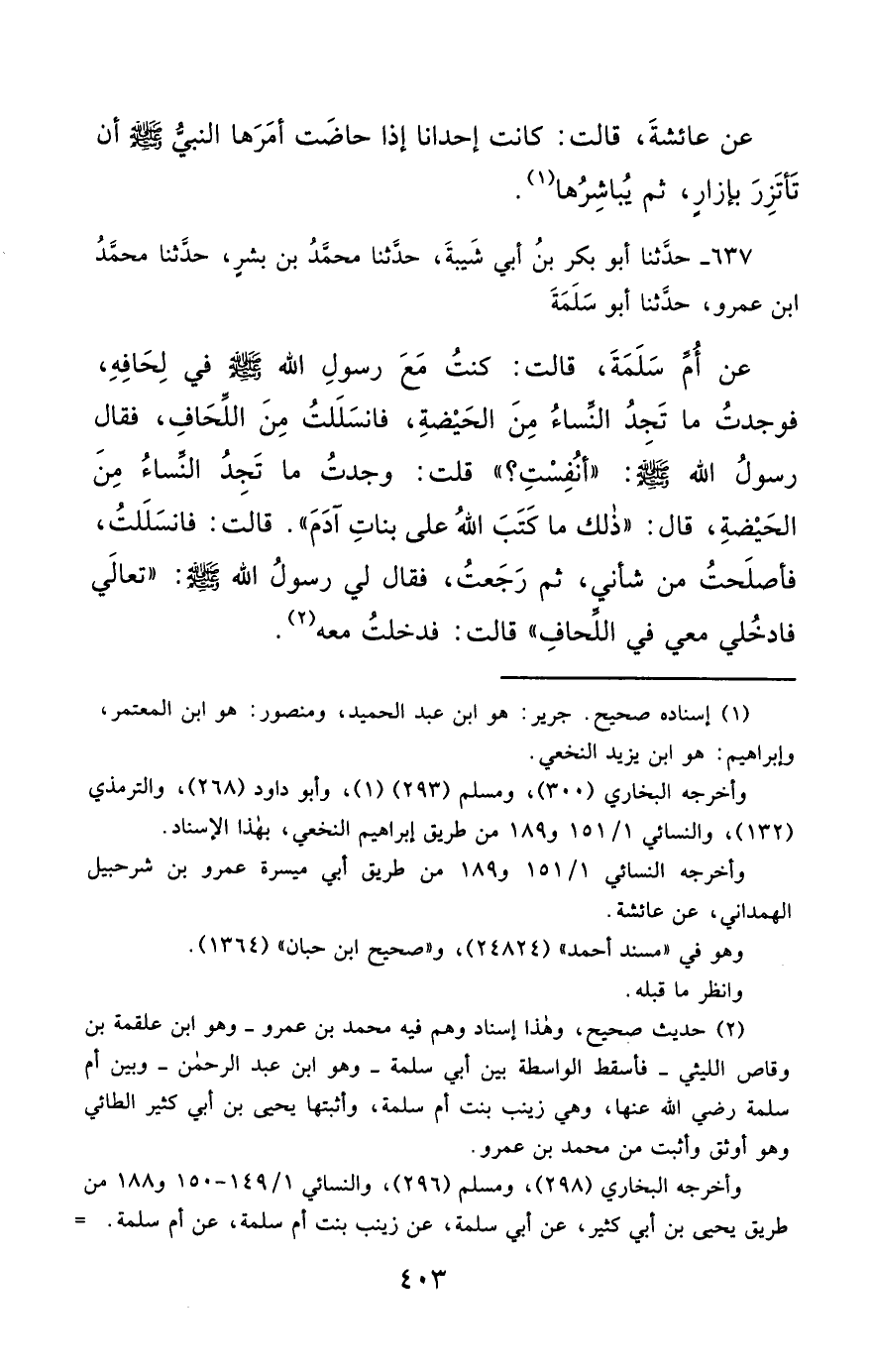 637- حَدَّثَنَا أَبُو بَكْرِ بْنُ أَبِي شَيْبَةَ ، حَدَّثَنَا مُحَمَّدُ بْنُ بِشْرٍ ، حَدَّثَنَا مُحَمَّدُ بْنُ عَمْرٍو ، حَدَّثَنَا أَبُو سَلَمَةَ ، عَنْ أُمِّ سَلَمَةَ ، قَالَتْ : كُنْتُ مَعَ رَسُولِ اللهِ صَلَّى الله عَليْهِ وسَلَّمَ فِي لِحَافِهِ ، فَوَجَدْتُ مَا تَجِدُ النِّسَاءُ مِنَ الْحَيْضَةِ ، فَانْسَلَلْتُ مِنَ اللِّحَافِ ، فَقَالَ رَسُولُ اللهِ صَلَّى الله عَليْهِ وسَلَّمَ : أَنُفِسْتِ ؟ قُلْتُ : وَجَدْتُ مَا تَجِدُ النِّسَاءُ مِنَ الْحَيْضَةِ ، قَالَ : ذَلِكِ مَا كَتَبَ اللَّهُ عَلَى بَنَاتِ آدَمَ , قَالَتْ : فَانْسَلَلْتُ ، فَأَصْلَحْتُ مِنْ شَأْنِي ، ثُمَّ رَجَعْتُ ، فَقَالَ لِي رَسُولُ اللهِ صَلَّى الله عَليْهِ وسَلَّمَ : تَعَالَيْ ، فَادْخُلِي مَعِي فِي اللِّحَافِ , قَالَتْ : فَدَخَلْتُ مَعَهُ.