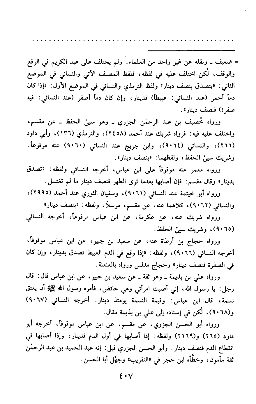 = ضعيف- ونقله عن غير واحد من العلماء. ولم يختلف على عبد الكريم في الرفع والوقف، لكن اختلف عليه في لفظه، فلفظ المصنف الآتي والنسائي في الموضع الثاني: "يتصدق بنصف دينار" ولفظ الترمذي والنسائي في الموضع الأول: "إذا كان دمًا أحمر (عند النسائي: عبيطًا) فدينار، وإن كان دمًا أصفر (عند النسائي: فيه صفرة) فنصف دينار".