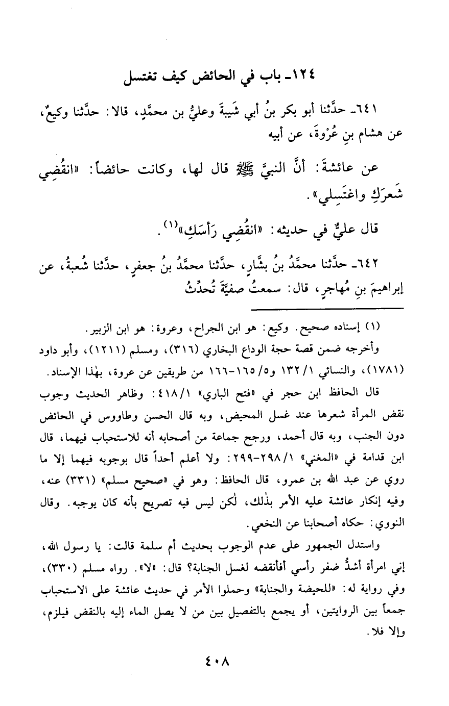 641- حَدَّثَنَا أَبُو بَكْرِ بْنُ أَبِي شَيْبَةَ , وَعَلِيُّ بْنُ مُحَمَّدٍ ، قَالاَ : حَدَّثَنَا وَكِيعٌ ، عَنْ هِشَامِ بْنِ عُرْوَةَ ، عَنْ أَبِيهِ ، عَنْ عَائِشَةَ , أَنَّ النَّبِيَّ صَلَّى الله عَليْهِ وسَلَّمَ قَالَ لَهَا ، وَكَانَتْ حَائِضًا : انْقُضِي شَعْرَكِ ، وَاغْتَسِلِي.