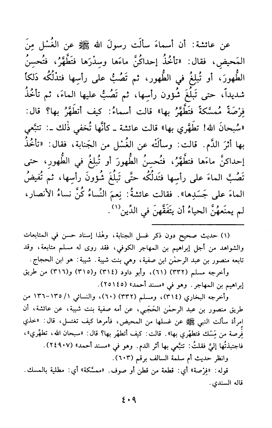 عَنْ عَائِشَةَ أَنَّ «أَسْمَاءَ» سَأَلَتْ رَسُولَ اللَّهِ - صَلَّى اللَّهُ عَلَيْهِ وَسَلَّمَ - عَنْ الْغُسْلِ مِنْ الْمَحِيضِ، فَقَالَ: "تَأْخُذُ إِحْدَاكُنَّ مَاءَهَا وَسِدْرَهَا فَتَطْهُرُ، فَتُحْسِنُ الطُّهُورَ، أَوْ تَبْلُغُ فِي الطُّهُورِ، ثُمَّ تَصُبُّ عَلَى رَأْسِهَا فَتَدْلُكُهُ دَلْكًا شَدِيدًا حَتَّى تَبْلُغَ شُؤُونَ رَأْسِهَا، ثُمَّ تَصُبُّ عَلَيْهَا الْمَاءَ ثُمَّ تَأْخُذُ فِرْصَةً مُمَسَّكَةً فَتَطْهُرُ بِهَا" قَالَتْ أَسْمَاءُ: كَيْفَ أَتَطَهَّرُ بِهَا؟ قَالَ: "سُبْحَانَ اللَّهِ! تَطَهَّرِي بِهَا" قَالَتْ عَائِشَةُ - كَأَنَّهَا تُخْفِي ذَلِكَ-: تَتَبَّعِي بِهَا أَثَرَ الدَّمِ، قَالَتْ: وَسَأَلَتْهُ عَنْ الْغُسْلِ مِنْ الْجَنَابَةِ، فَقَالَ: "تَأْخُذُ إِحْدَاكُنَّ مَاءَهَا فَتَطْهُرُ فَتُحْسِنُ الطُّهُورَ أَوْ تَبْلُغُ فِي الطُّهُورِ، حَتَّى تَصُبَّ الْمَاءَ عَلَى رَأْسِهَا فَتَدْلُكُهُ حَتَّى تَبْلُغَ شُؤُونَ رَأْسِهَا، ثُمَّ تُفِيضُ الْمَاءَ عَلَى جَسَدِهَا". فَقَالَتْ عَائِشَةُ: نِعْمَ النِّسَاءُ كن نِسَاءُ الْأَنْصَارِ، لَمْ يَمْنَعْهُنَّ الْحَيَاءُ أَنْ يَتَفَقَّهْنَ فِي الدِّينِ (¬1).