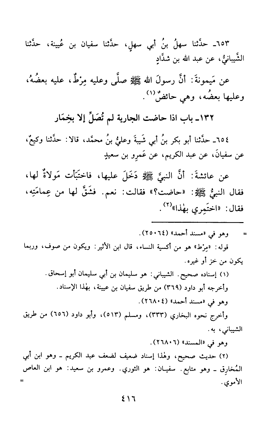 653- حَدَّثَنَا سَهْلُ بْنُ أَبِي سَهْلٍ ، حَدَّثَنَا سُفْيَانُ بْنُ عُيَيْنَةَ ، حَدَّثَنَا الشَّيْبَانِيُّ ، عَنْ عَبْدِ اللهِ بْنِ شَدَّادٍ ، عَنْ مَيْمُونَةَ ، أَنَّ رَسُولَ اللهِ صَلَّى الله عَليْهِ وسَلَّمَ صَلَّى وَعَلَيْهِ مِرْطٌ , عَلَيْهِ بَعْضُهُ ، وَعَلَيْهَا بَعْضُهُ ، وَهِيَ حَائِضٌ.