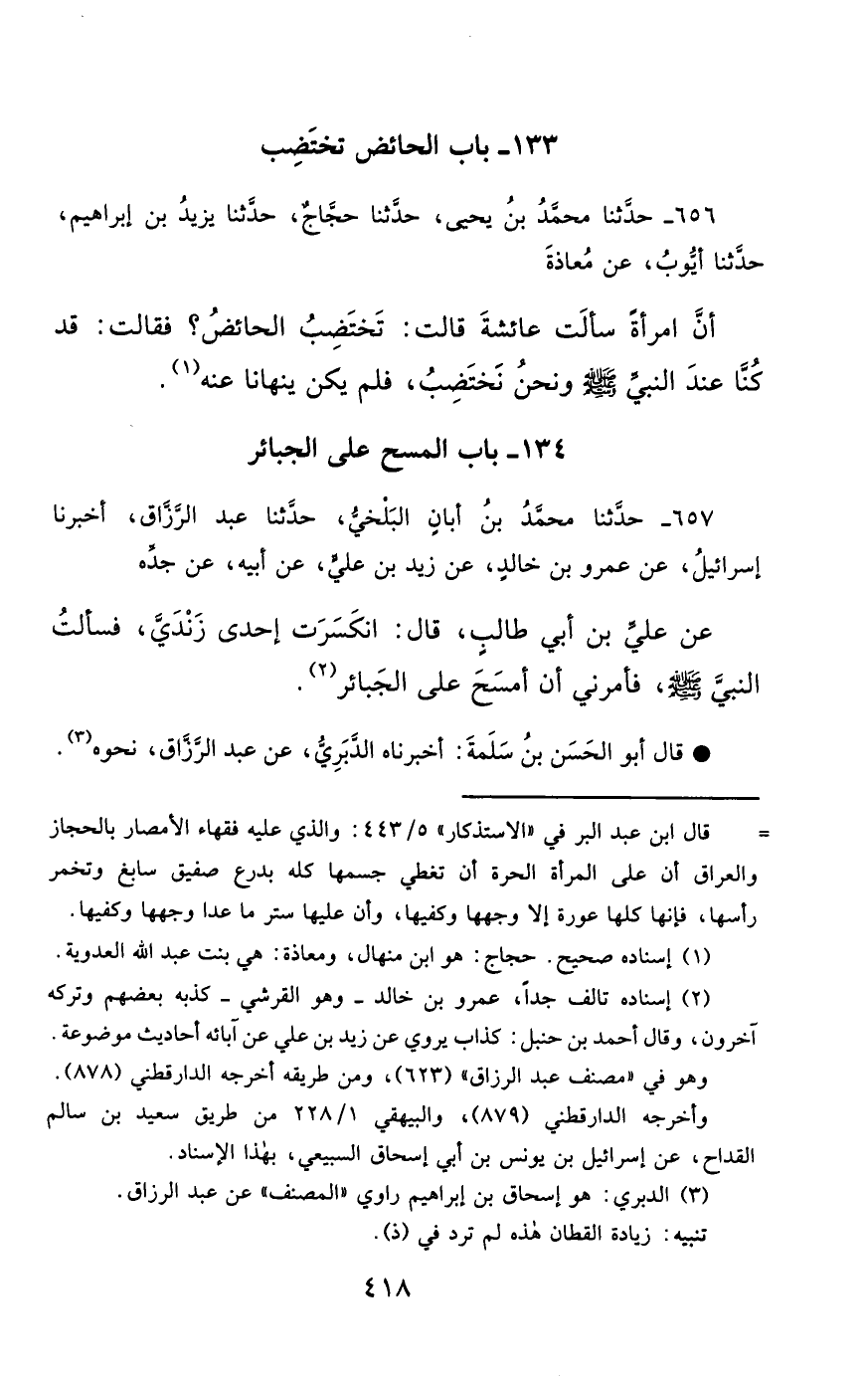 656- حَدَّثَنَا مُحَمَّدُ بْنُ يَحْيَى ، حَدَّثَنَا حَجَّاجٌ ، حَدَّثَنَا يَزِيدُ بْنُ إِبْرَاهِيمَ ، حَدَّثَنَا أَيُّوبُ ، عَنْ مُعَاذَةَ , أَنَّ امْرَأَةً سَأَلَتْ عَائِشَةَ ، قَالَتْ : تَخْتَضِبُ الْحَائِضُ ؟ فَقَالَتْ : قَدْ كُنَّا عِنْدَ النَّبِيِّ صَلَّى الله عَليْهِ وسَلَّمَ وَنَحْنُ نَخْتَضِبُ ، فَلَمْ يَكُنْ يَنْهَانَا عَنْهُ.