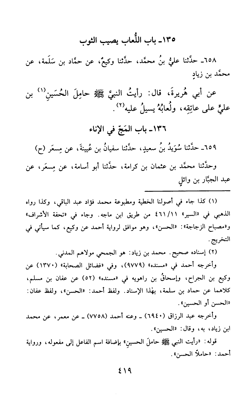 658- حَدَّثَنَا عَلِيُّ بْنُ مُحَمَّدٍ ، حَدَّثَنَا وَكِيعٌ ، عَنْ حَمَّادِ بْنِ سَلَمَةَ ، عَنْ مُحَمَّدِ بْنِ زِيَادٍ ، عَنْ أَبِي هُرَيْرَةَ , قَالَ : رَأَيْتُ النَّبِيَّ صَلَّى الله عَليْهِ وسَلَّمَ حَامِلَ الْحُسَيْنِ بْنِ عَلِيٍّ عَلَى عَاتِقِهِ ، وَلُعَابُهُ يَسِيلُ عَلَيْهِ.