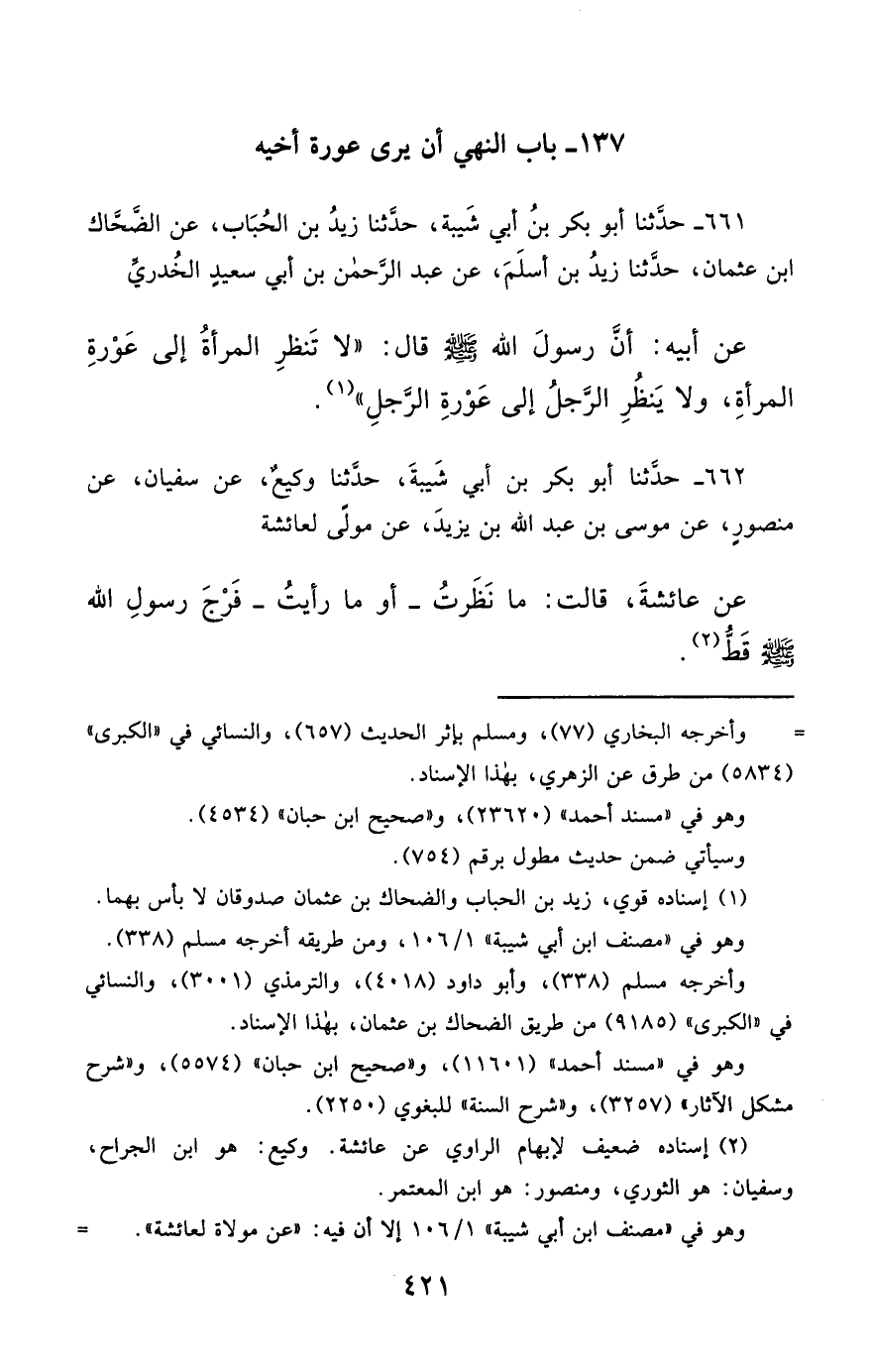 661- حَدَّثَنَا أَبُو بَكْرِ بْنُ أَبِي شَيْبَةَ ، حَدَّثَنَا زَيْدُ بْنُ الْحُبَابِ ، عَنِ الضَّحَّاكِ بْنِ عُثْمَانَ ، حَدَّثَنَا زَيْدُ بْنُ أَسْلَمَ ، عَنْ عَبْدِ الرَّحْمَنِ بْنِ أَبِي سَعِيدٍ الْخُدْرِيِّ ، عَنْ أَبِيهِ , أَنَّ رَسُولَ اللهِ صَلَّى الله عَليْهِ وسَلَّمَ ، قَالَ : لاَ تَنْظُرِ الْمَرْأَةُ إِلَى عَوْرَةِ الْمَرْأَةِ ، وَلاَ يَنْظُرِ الرَّجُلُ إِلَى عَوْرَةِ الرَّجُلِ.