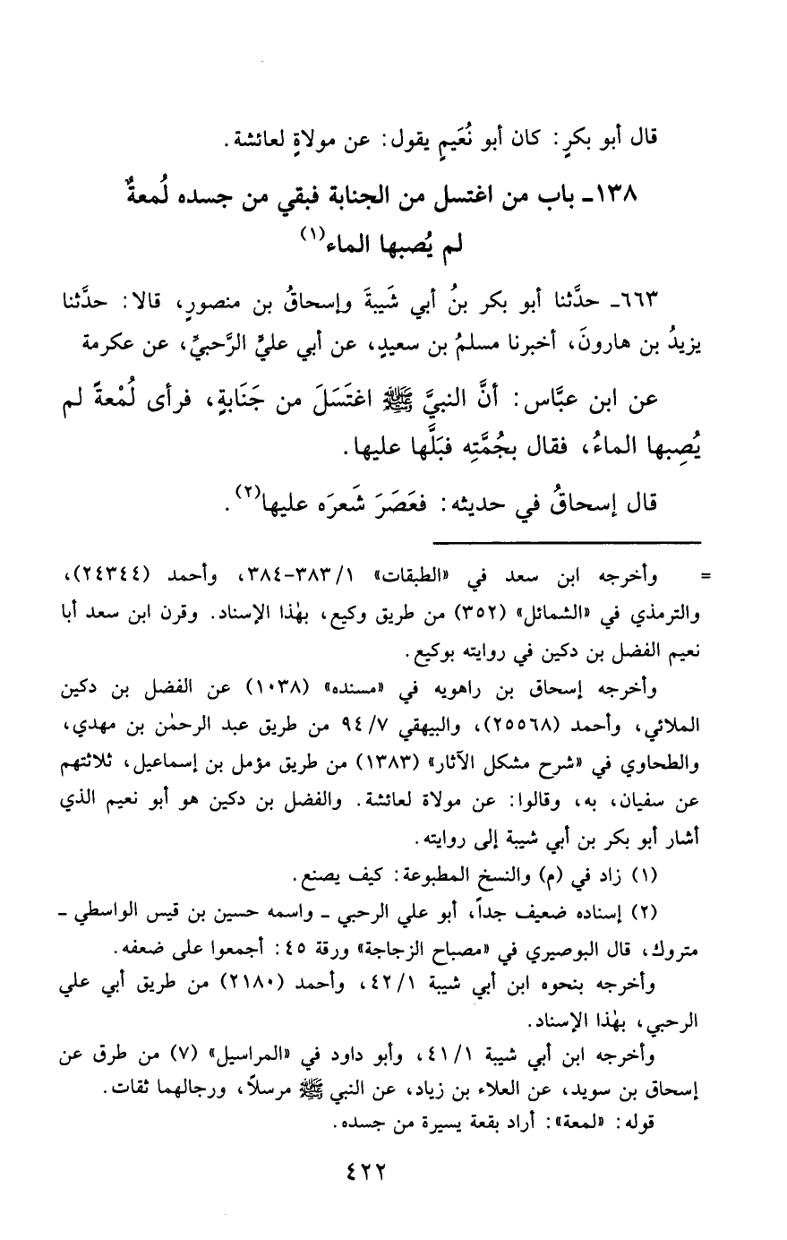 663- حَدَّثَنَا أَبُو بَكْرِ بْنُ أَبِي شَيْبَةَ , وَإِسْحَاقُ بْنُ مَنْصُورٍ ، قَالاَ : حَدَّثَنَا يَزِيدُ بْنُ هَارُونَ ، أَخْبَرَنَا مُسْتَلِمُ بْنُ سَعِيدٍ (1)، عَنْ أَبِي عَلِيٍّ الرَّحَبِيِّ ، عَنْ عِكْرِمَةَ ، عَنِ ابْنِ عَبَّاسٍ ، أَنَّ النَّبِيَّ صَلَّى الله عَليْهِ وسَلَّمَ اغْتَسَلَ مِنْ جَنَابَةٍ ، فَرَأَى لُمْعَةً لَمْ يُصِبْهَا الْمَاءُ ، فَقَالَ بِجُمَّتِهِ ، فَبَلَّهَا عَلَيْهَا.