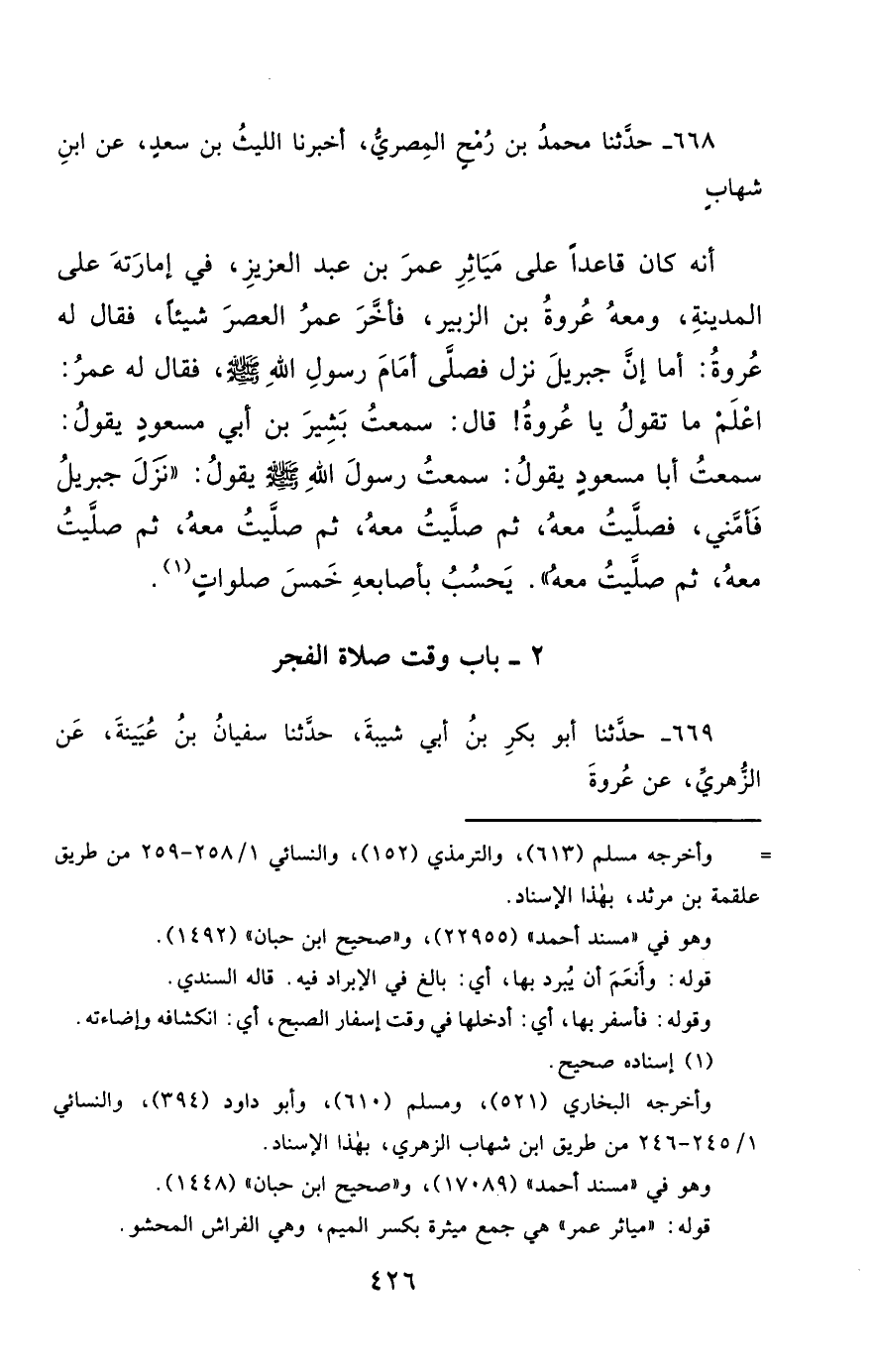 668 - حَدَّثَنَا مُحَمَّدُ بْنُ رُمْحٍ الْمِصْرِيُّ، أَخْبَرَنَا اللَّيْثُ بْنُ سَعْدٍ، عَنِ ابْنِ شِهَابٍ , أَنَّهُ كَانَ قَاعِدًا عَلَى مَيَاثِرِ عُمَرَ بْنِ عَبْدِ الْعَزِيزِ , فِي إِمَارَتِهِ عَلَى الْمَدِينَةِ، وَمَعَهُ عُرْوَةُ بْنُ الزُّبَيْرِ، فَأَخَّرَ عُمَرُ الْعَصْرَ شَيْئًا، فَقَالَ لَهُ عُرْوَةُ: أَمَا إِنَّ جِبْرِيلَ نَزَلَ، فَصَلَّى إِمَامَ رَسُولِ اللهِ صَلَّى الله عَليْهِ وسَلَّمَ، فَقَالَ لَهُ عُمَرُ: اعْلَمْ مَا تَقُولُ يَا عُرْوَةُ , قَالَ: سَمِعْتُ بَشِيرَ بْنَ أَبِي مَسْعُودٍ يَقُولُ: سَمِعْتُ أَبَا مَسْعُودٍ يَقُولُ: سَمِعْتُ رَسُولَ اللهِ صَلَّى الله عَليْهِ وسَلَّمَ يَقُولُ: نَزَلَ جِبْرِيلُ، فَأَمَّنِي، فَصَلَّيْتُ مَعَهُ، ثُمَّ صَلَّيْتُ مَعَهُ، ثُمَّ صَلَّيْتُ مَعَهُ، ثُمَّ صَلَّيْتُ مَعَهُ، ثُمَّ صَلَّيْتُ مَعَهُ , يَحْسُبُ بِأَصَابِعِهِ خَمْسَ صَلَوَاتٍ.
