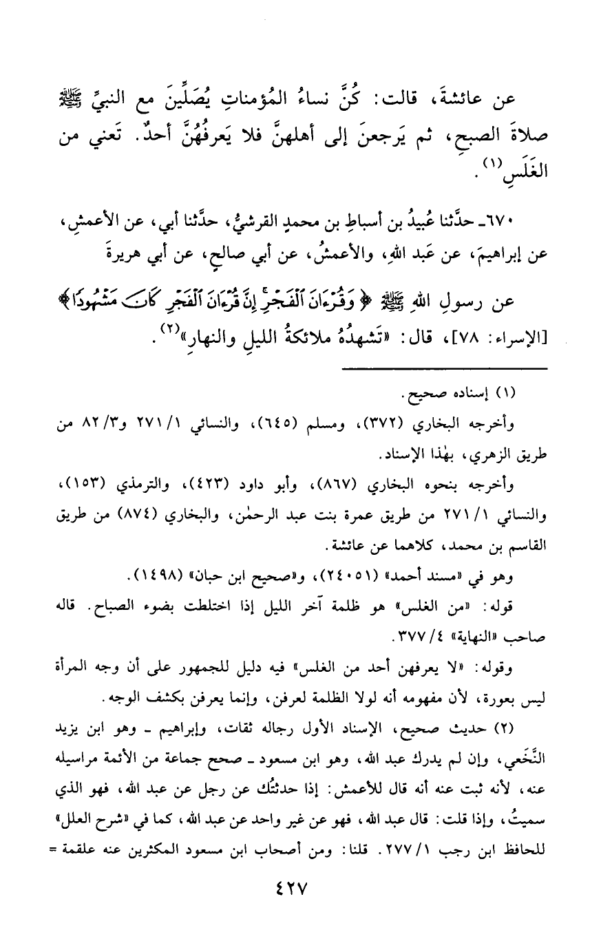 670- حَدَّثَنَا عُبَيْدُ بْنُ أَسْبَاطِ بْنِ مُحَمَّدٍ الْقُرَشِيُّ ، حَدَّثَنَا أَبِي ، عَنِ الأَعْمَشِ ، عَنْ إِبْرَاهِيمَ ، عَنْ عَبْدِ اللهِ , وَالأَعْمَشُ ، عَنْ أَبِي صَالِحٍ ، عَنْ أَبِي هُرَيْرَةَ ، عَنْ رَسُولِ اللهِ صَلَّى الله عَليْهِ وسَلَّمَ : {وَقُرْآنَ الْفَجْرِ إِنَّ قُرْآنَ الْفَجْرِ كَانَ مَشْهُودًا} قَالَ : تَشْهَدُهُ مَلاَئِكَةُ اللَّيْلِ وَالنَّهَارِ.