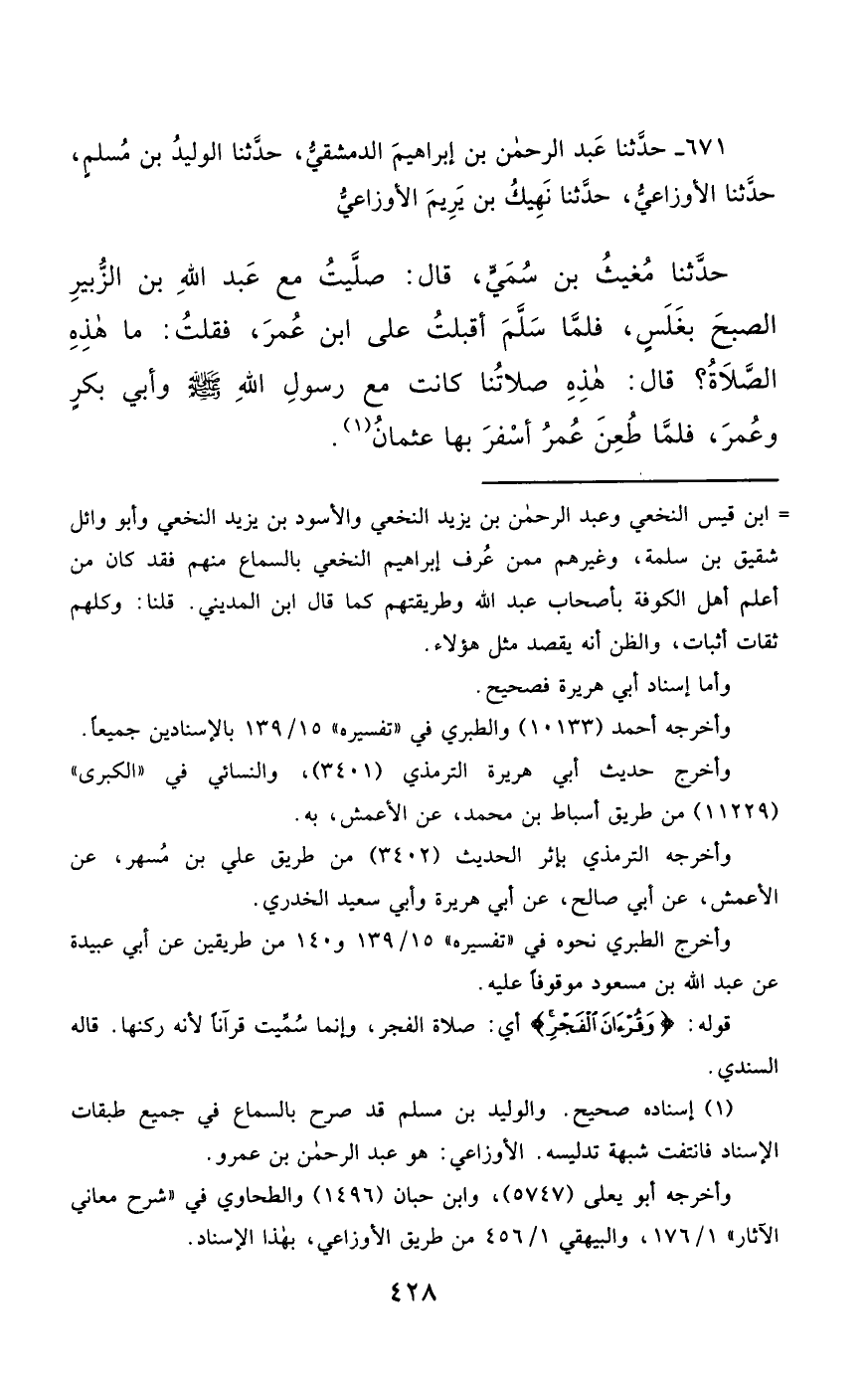 671- حَدَّثَنَا عَبْدُ الرَّحْمَنِ بْنُ إِبْرَاهِيمَ الدِّمَشْقِيُّ ، حَدَّثَنَا الْوَلِيدُ بْنُ مُسْلِمٍ ، حَدَّثَنَا الأَوْزَاعِيُّ ، حَدَّثَنَا نَهِيكُ بْنُ يَرِيمَ الأَوْزَاعِيُّ ، حَدَّثَنَا مُغِيثُ بْنُ سُمَيٍّ ، قَالَ : صَلَّيْتُ مَعَ عَبْدِ اللهِ بْنِ الزُّبَيْرِ الصُّبْحَ بِغَلَسٍ ، فَلَمَّا سَلَّمَ ، أَقْبَلْتُ عَلَى ابْنِ عُمَرَ ، فَقُلْتُ : مَا هَذِهِ الصَّلاَةُ ؟ قَالَ : هَذِهِ صَلاَتُنَا ، كَانَتْ مَعَ رَسُولِ اللهِ صَلَّى الله عَليْهِ وسَلَّمَ ، وَأَبِي بَكْرٍ ، وَعُمَرَ ، فَلَمَّا طُعِنَ عُمَرُ ، أَسْفَرَ بِهَا عُثْمَانُ.
